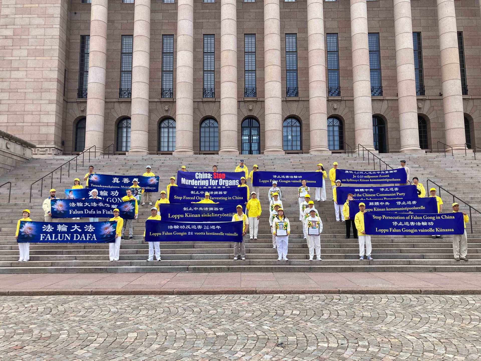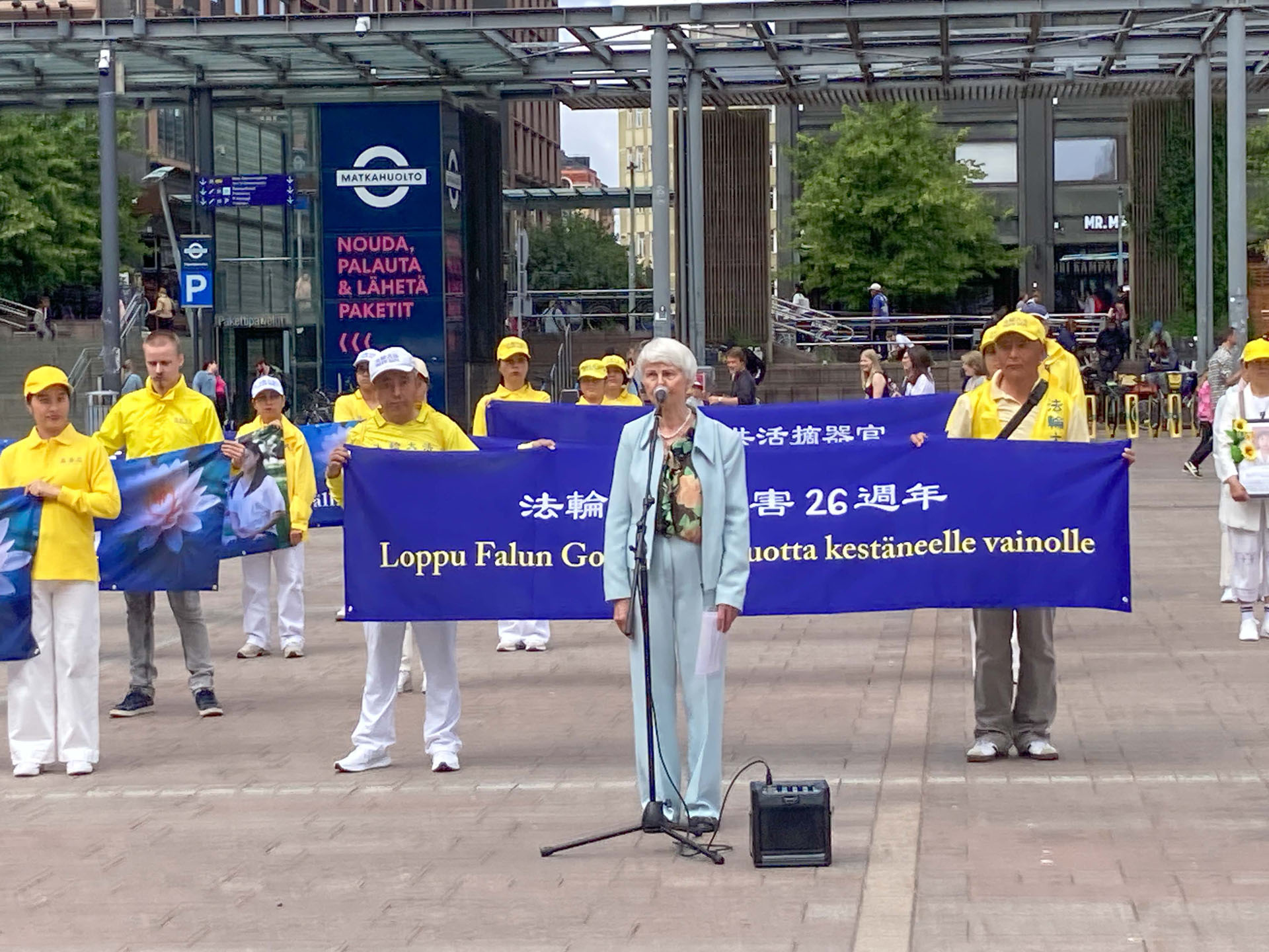 芬蘭法輪大法學會負責人西尼卡﹒索塔卡寧(Sinikka Suotakanen)在發言中表示,「修煉法輪大法身心受益良多,在中國廣泛傳播,吸引了數千萬修煉者,最終引發了中共政權的打壓與迫害。這場殘酷的鎮壓已經持續了二十六年,至今仍在繼續。