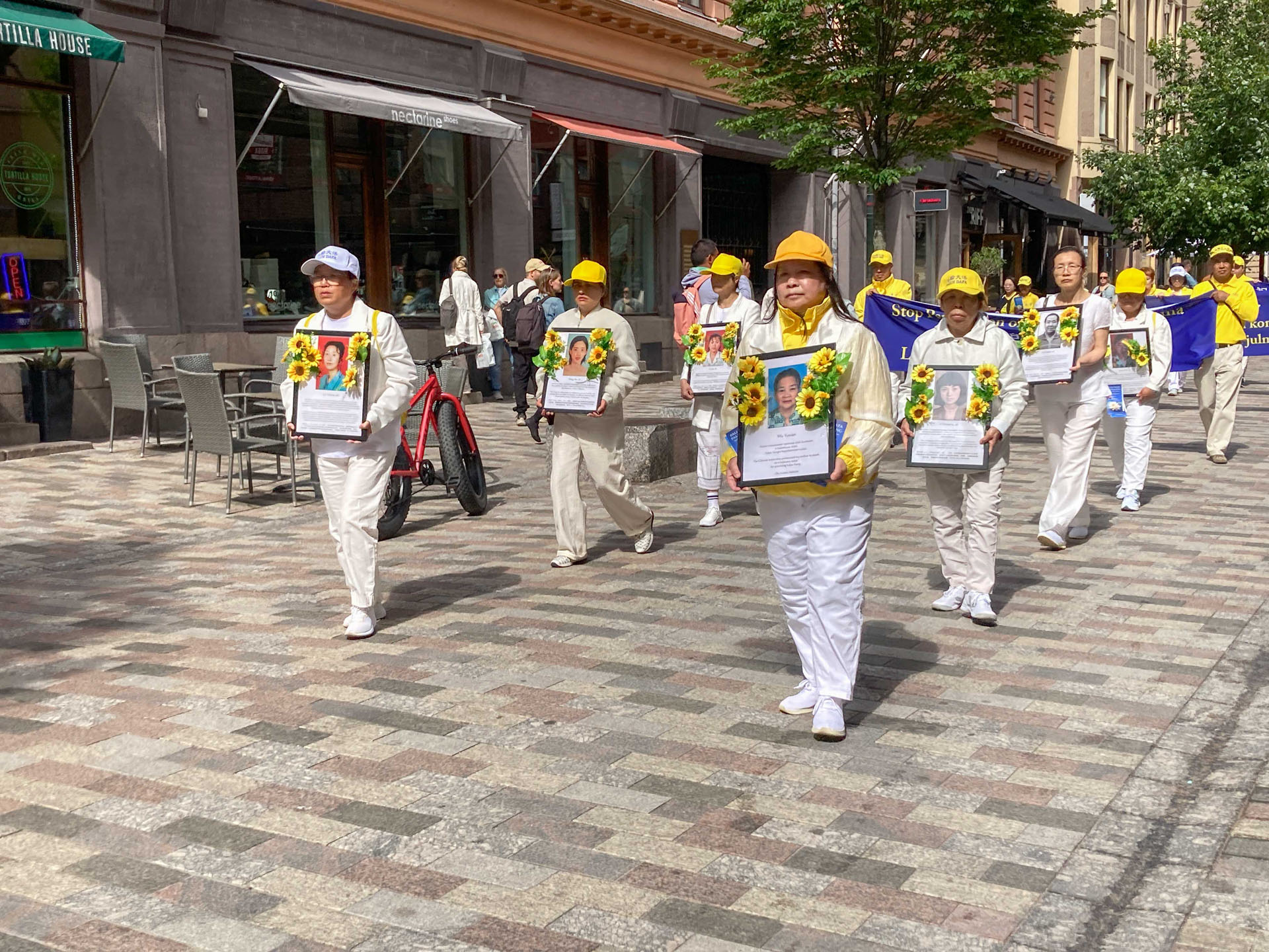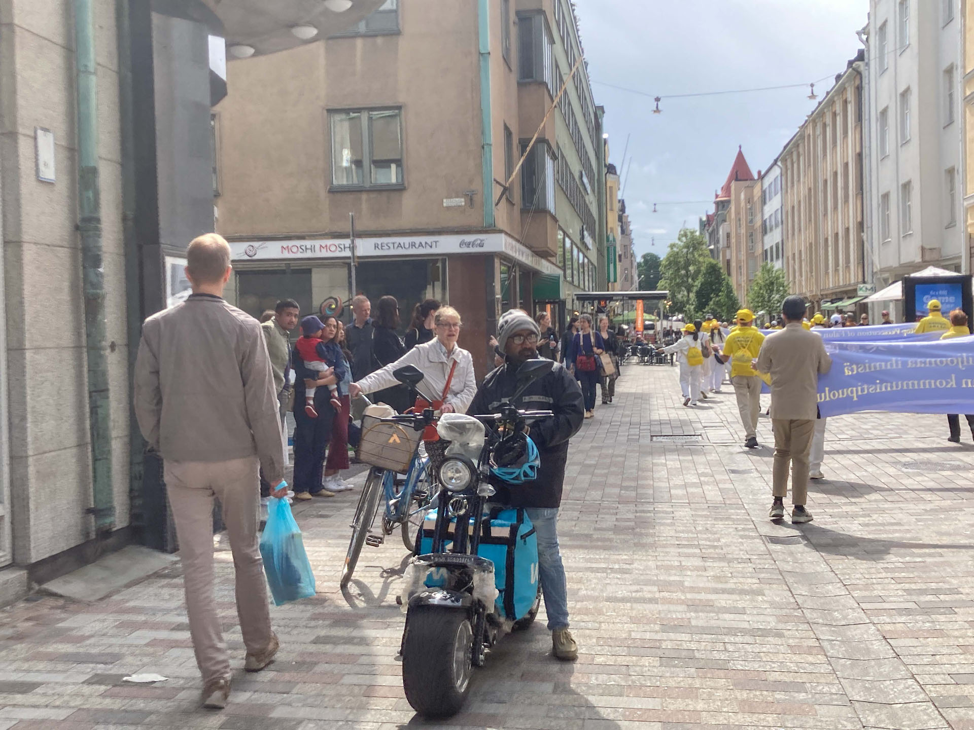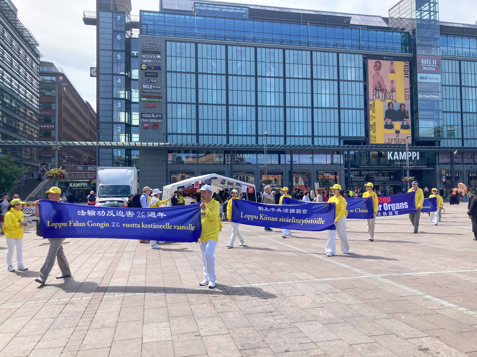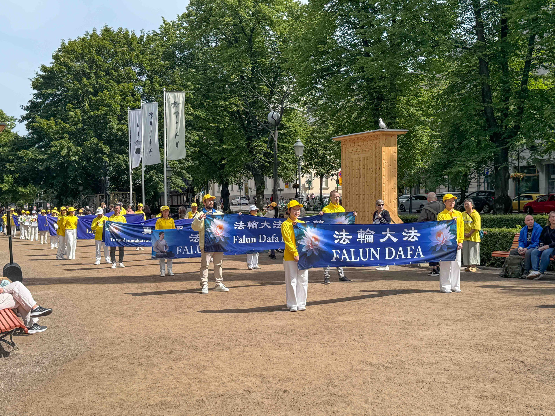 隨後,法輪功學員開始遊行,隊伍從購物中心幹比出發,途經赫爾辛基的主幹道曼納海姆路(Mannerheimintie)、著名的購物中心亞歷山大林卡圖(Aleksanterinkatu)、赫爾辛基大教堂、赫爾辛基市政廳、北濱海藝術中心公園(Pohjoisesplanadi)等多個城市地標,最後在芬蘭國會大廈前結束。