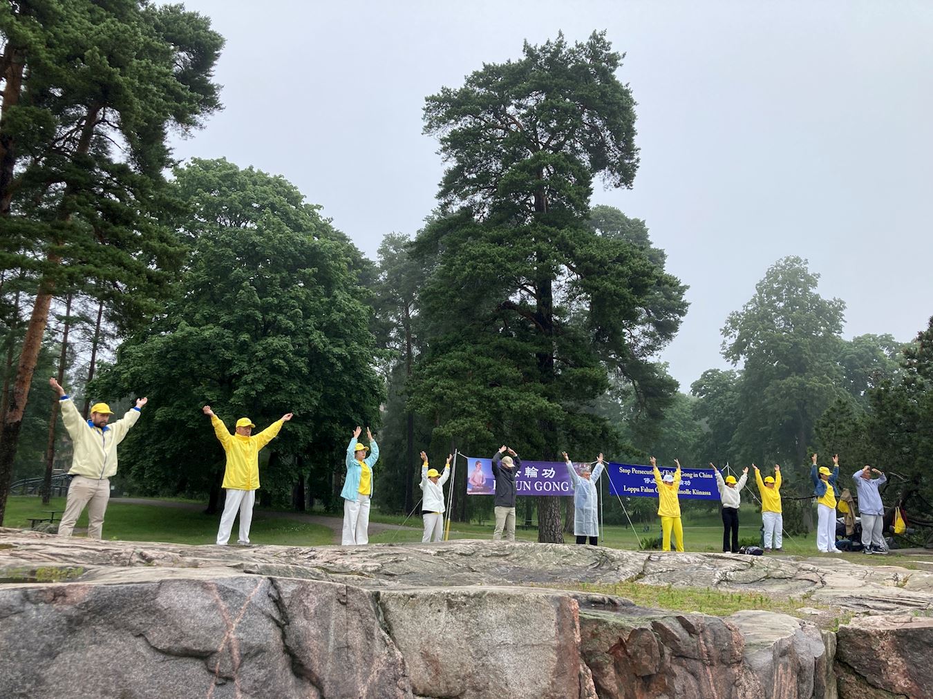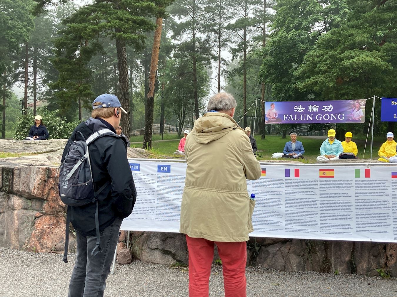 公園裏一位賣紀念品的芬蘭男士,他熱愛中國文化,說流利的中文,常常與華人遊客交流。因為法輪功學員長期在公園弘法,他對法輪功非常了解。學員向他介紹說:「昨天我們在赫爾辛基舉辦了遊行活動,所以有不少從外地趕來的學員參加集體煉功。現場的幾位學員都曾遭受過迫害。」隨後,學員還提到此前公園還發生過兩位華人襲擊法輪功學員的事件,該事件曾被芬蘭國家廣播公司YLE報導過。他立即拿出手機搜索相關新聞。之後感慨的說:「你們做的是非常重要的事情。」