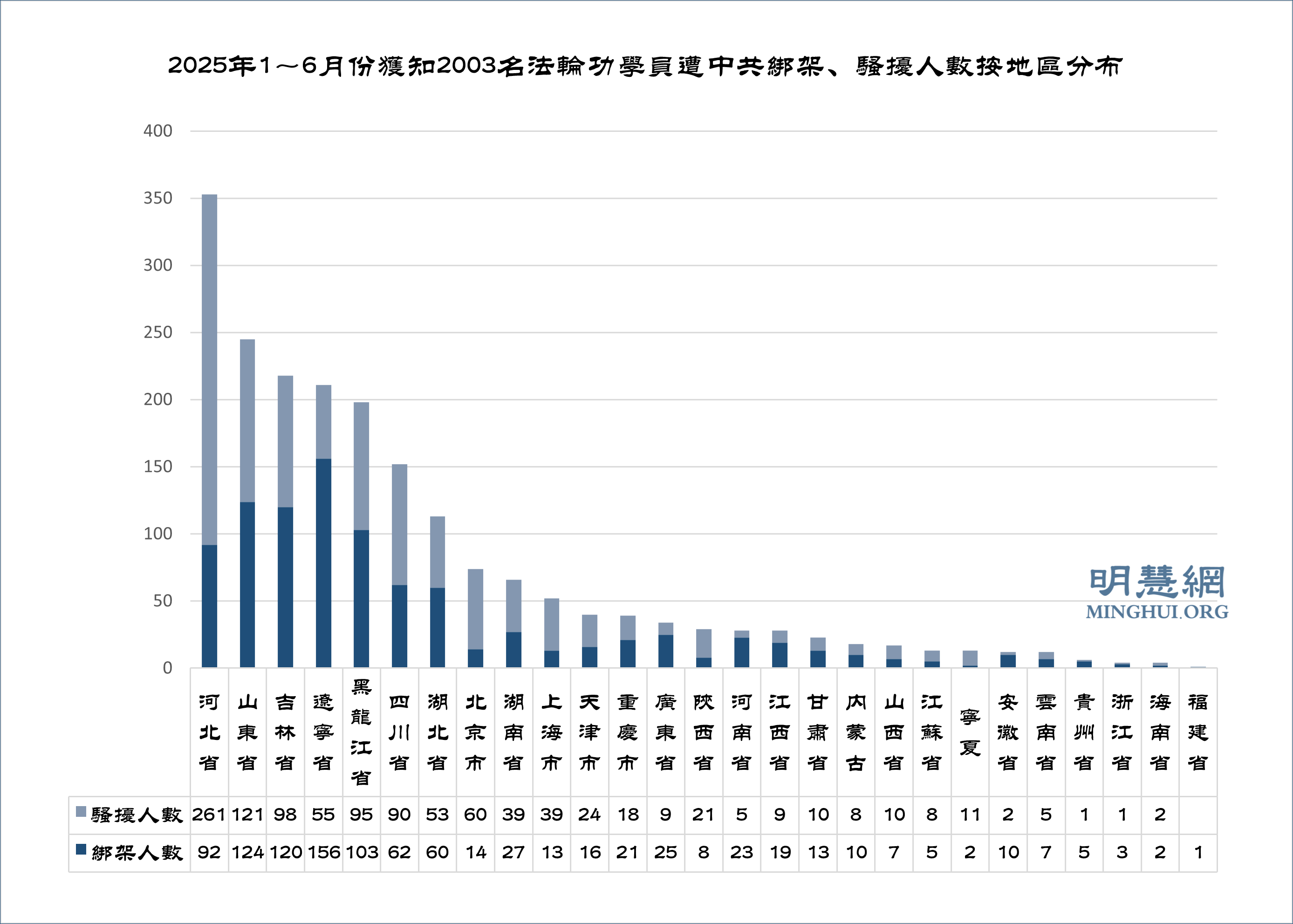 ![]() 圖3:2025年1~6月份獲知2003名法輪功學員遭中共綁架、騷擾人數按地區分布 |