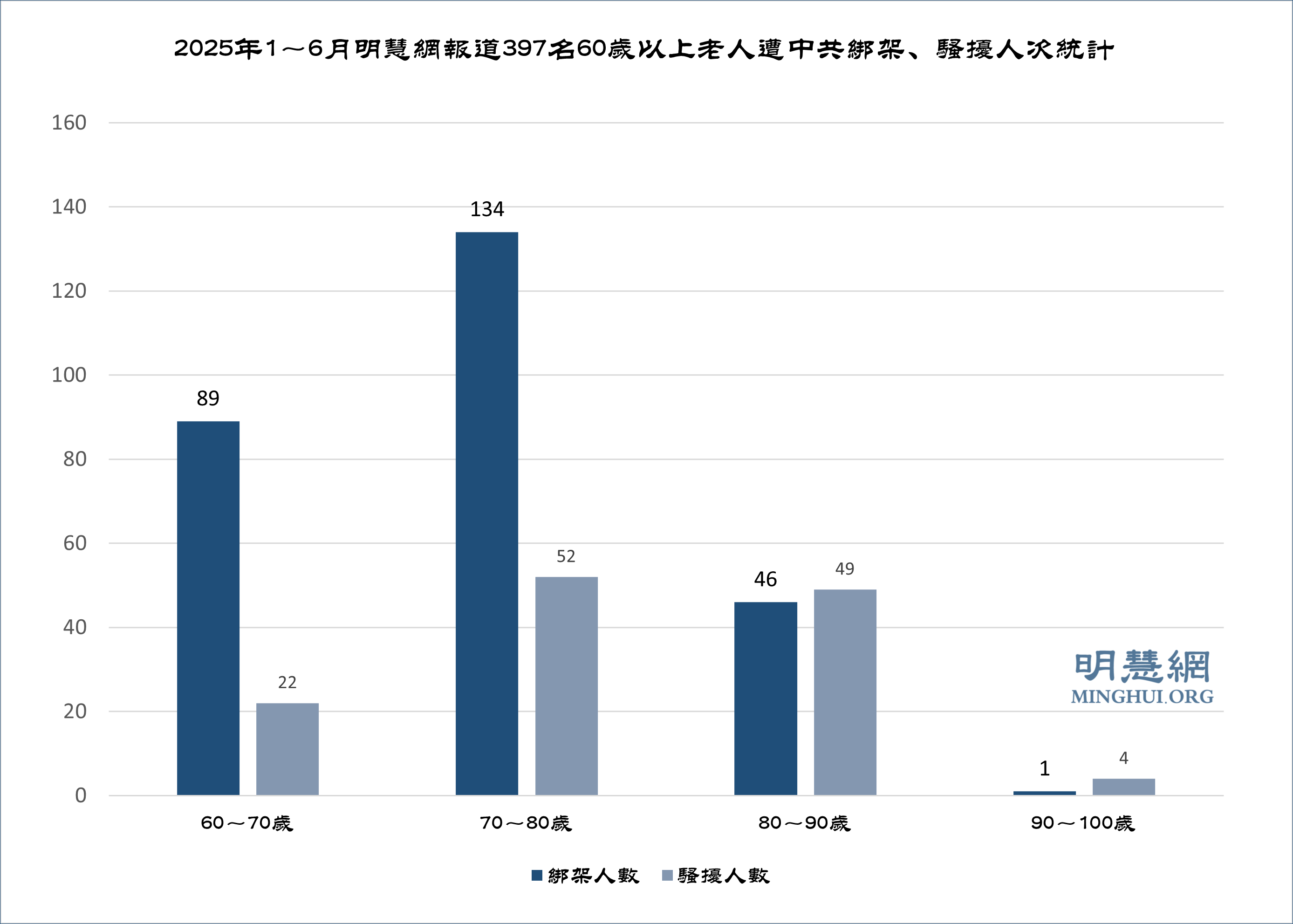 ![]() 圖4:2025年1~6月明慧網報導397名60歲以上老人遭中共綁架、騷擾人次統計 |