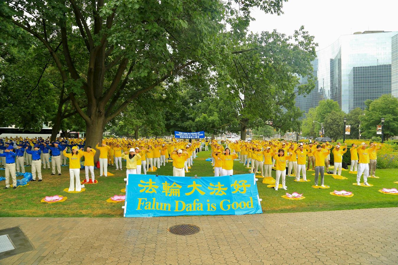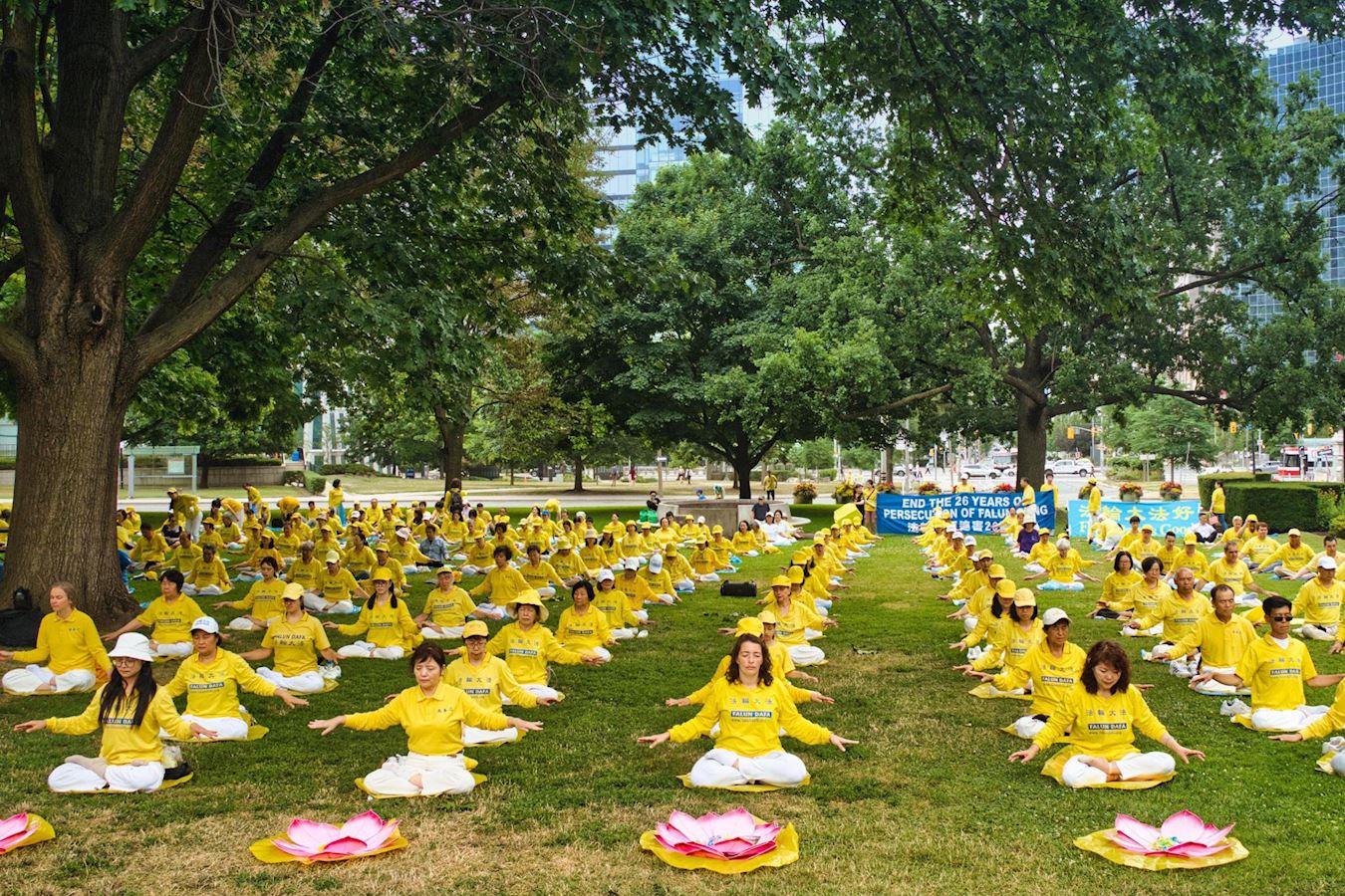 早上九點,學員們來到市中心的皇后公園(Queen』s Park),他們在草坪上集體煉功。期間,天空下著細雨,似乎在訴說著大法學員所蒙受的冤屈。在煉完五套功法後,雨過天晴,正值中午時分,學員們來到省議會大樓前舉辦集會,發表演講,呼籲社會關注和制止中共對法輪功學員的迫害。