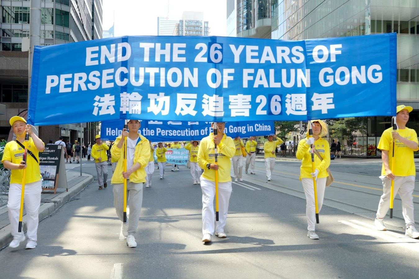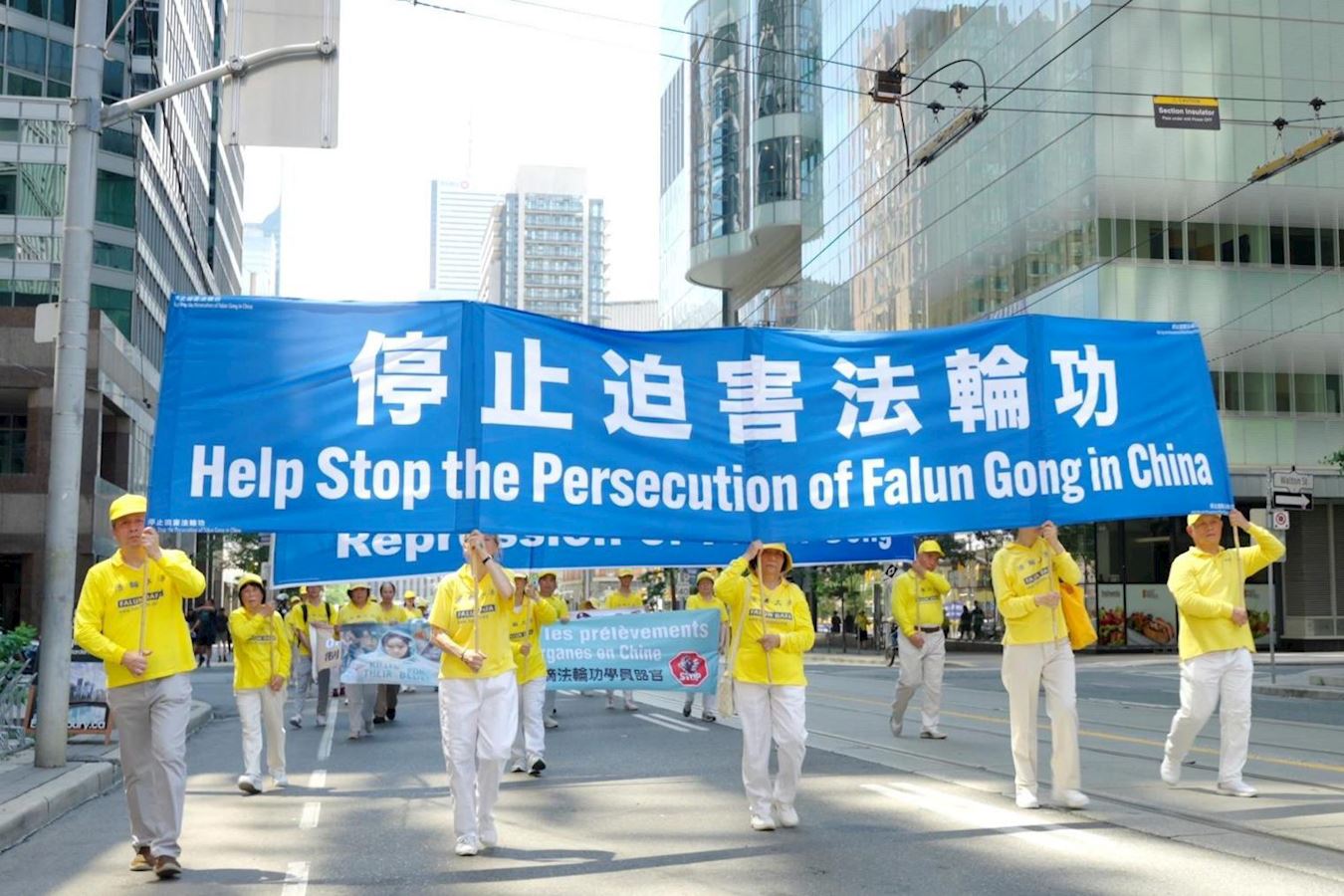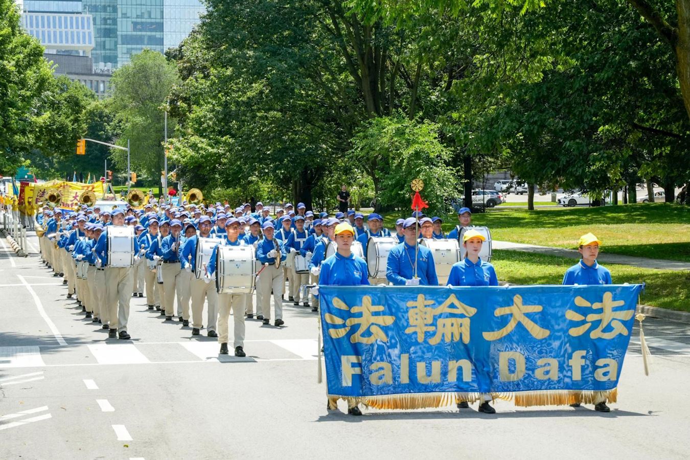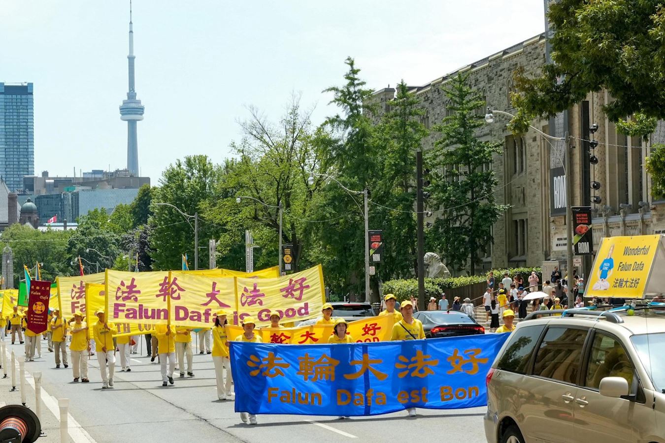 下午一點,學員們拉起各種橫幅,組成浩大的隊伍在市中心遊行,向世人傳遞大法的真相,並揭露中共的邪惡本質。遊行隊伍途徑大學路(University Avenue),布魯亞街(Bloor Street),卑街(Bay Street)和登打士街(Dundas Street),最後沿學院街(College Street)回到皇后公園,全程約一個半小時。