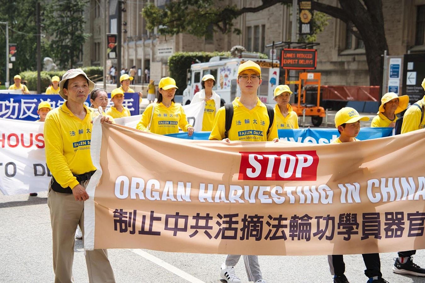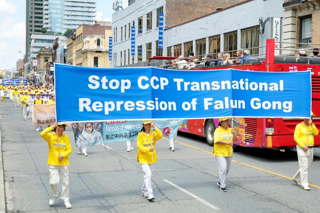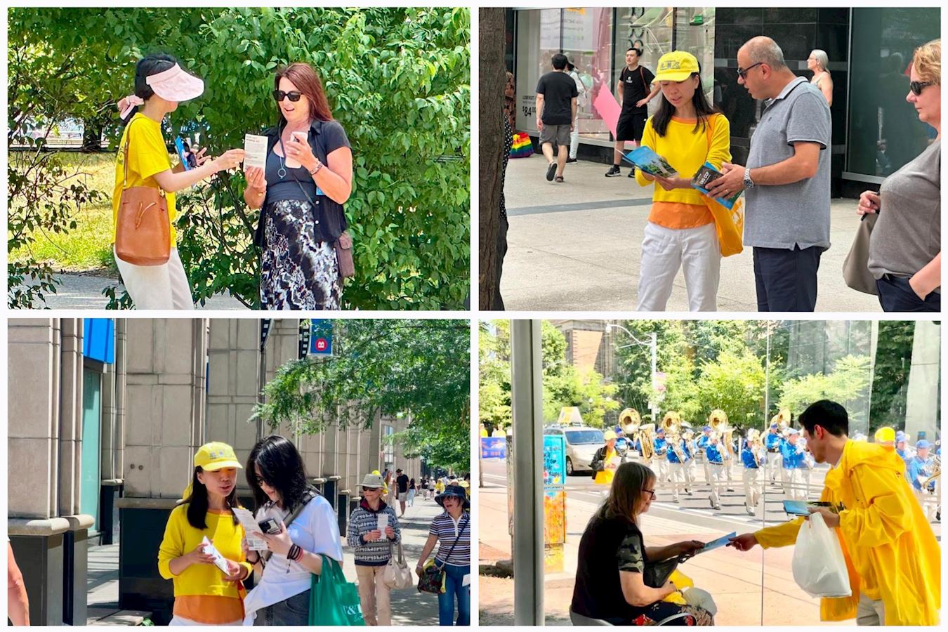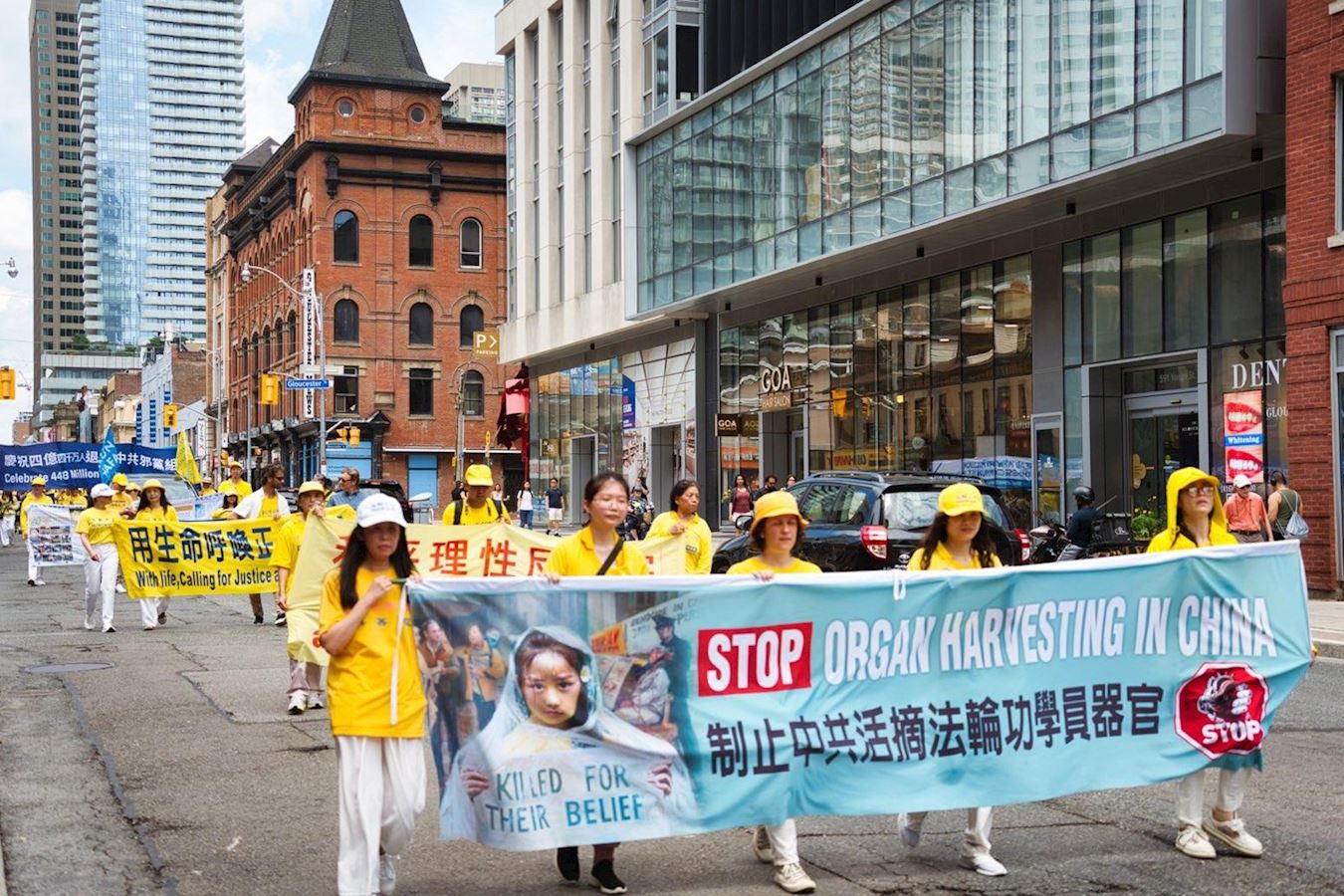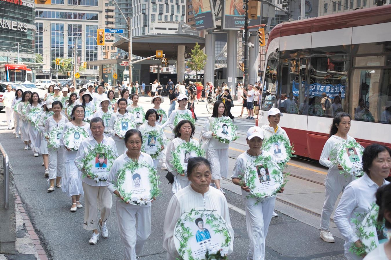 下午一點,學員們拉起各種橫幅,組成浩大的隊伍在市中心遊行,向世人傳遞大法的真相,並揭露中共的邪惡本質。遊行隊伍途徑大學路(University Avenue),布魯亞街(Bloor Street),卑街(Bay Street)和登打士街(Dundas Street),最後沿學院街(College Street)回到皇后公園,全程約一個半小時。