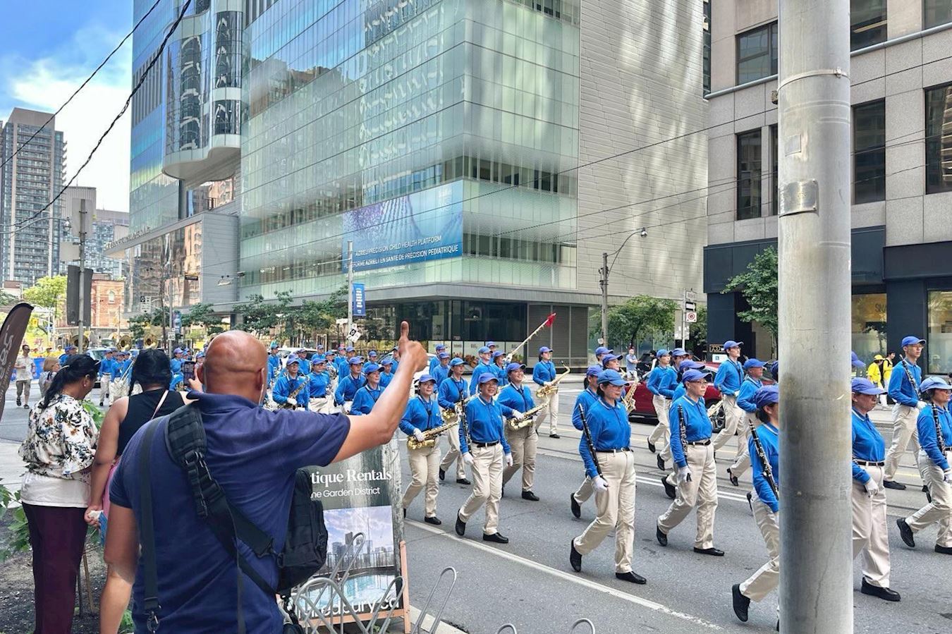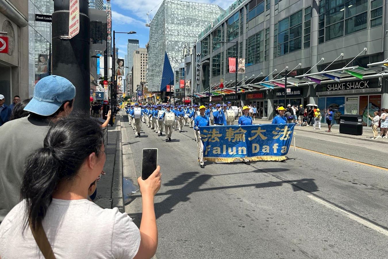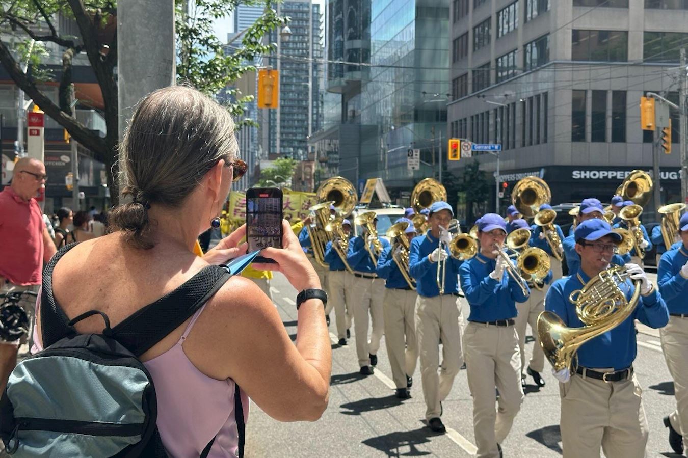 毛女士看著遊行隊伍浩浩蕩蕩,似乎沒有盡頭,她感歎道:「我挺震撼的,多倫多有這麼多人煉習法輪功呀!而且整齊有序。」