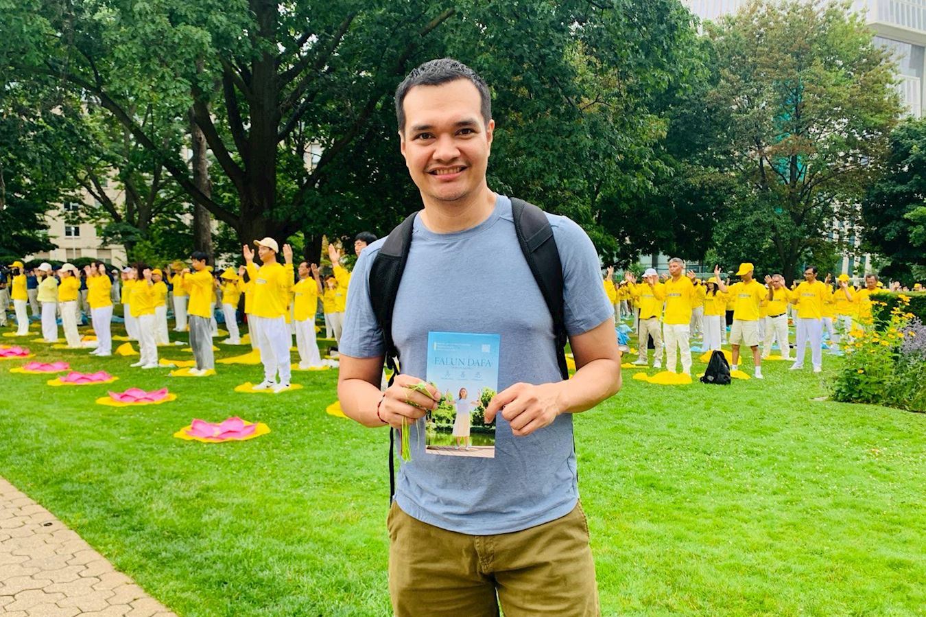 來自哥倫比亞,現居住在加拿大蒙特利爾的何塞(Jose)是一名數據分析師。他來到多倫多參觀、旅遊,在路過皇后公園時,看到了正在大煉功的法輪功學員們,何塞被寧靜祥和的場面所吸引,駐足觀看。學員向何塞介紹了法輪大法,他表示是第一次聽到法輪功,一直對打坐很感興趣,所以,當聽到法輪功的五套功法中也有打坐時,他表示會進一步到大法的免費教功網站了解更多。