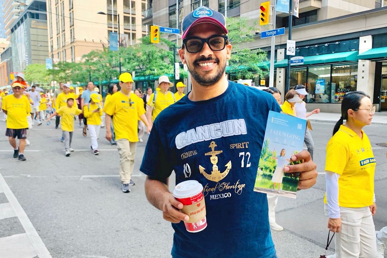 阿迪(Adi)居住在多倫多市區,他來自巴勒斯坦。當他從家中出來,正好看到了法輪功學員的遊行隊伍,他對來向他介紹大法和講真相的法輪功學員說:「這個遊行真壯觀,氣勢磅礡。」