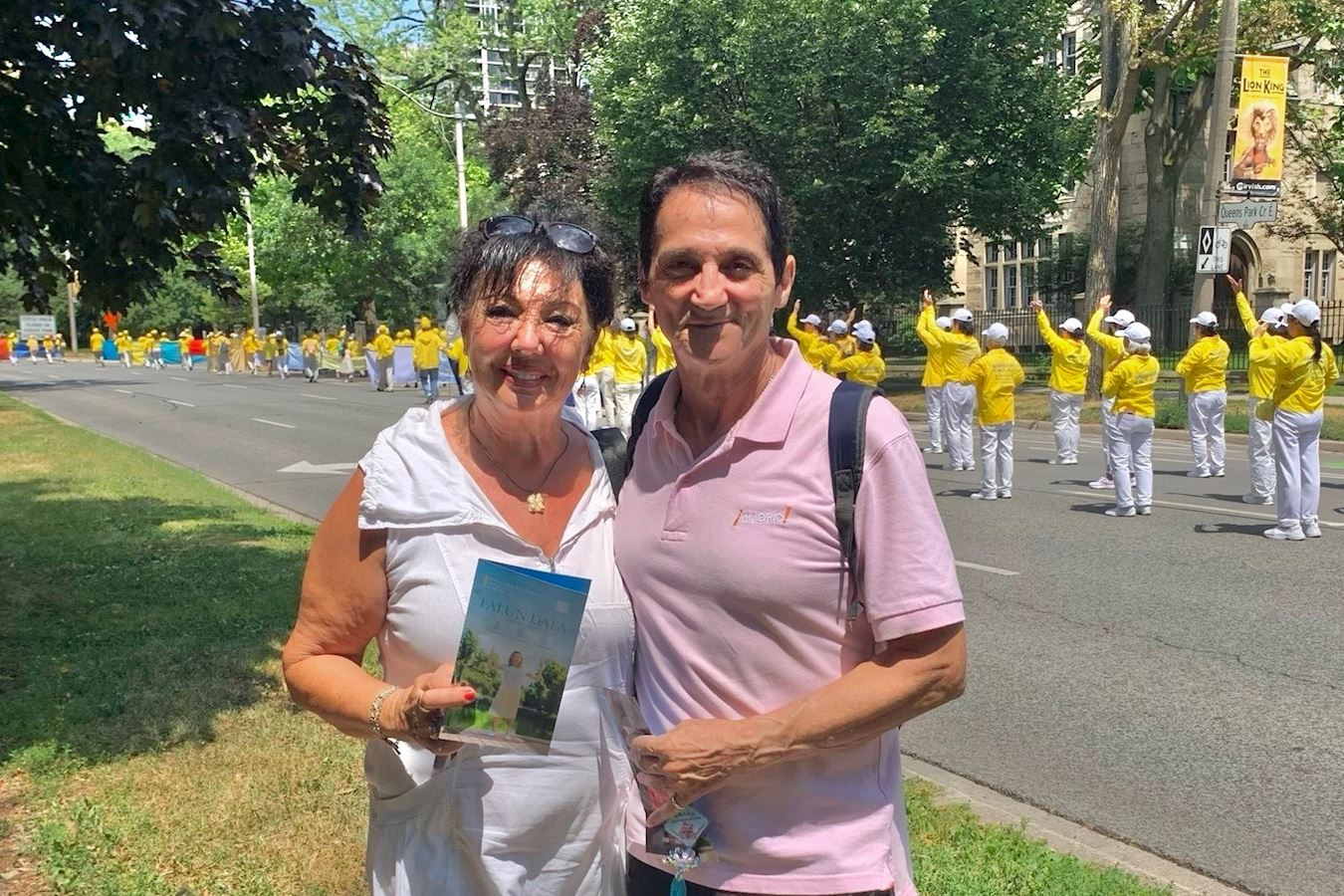 安傑爾(Angel)和他的妻子是來自西班牙的移民,現住在多倫多。當看到遊行隊伍前印有「法輪大法」字樣的橫幅時,安傑爾主動與學員攀談,表示自己很喜歡遊行隊伍的風貌,並詢問甚麼是法輪大法。