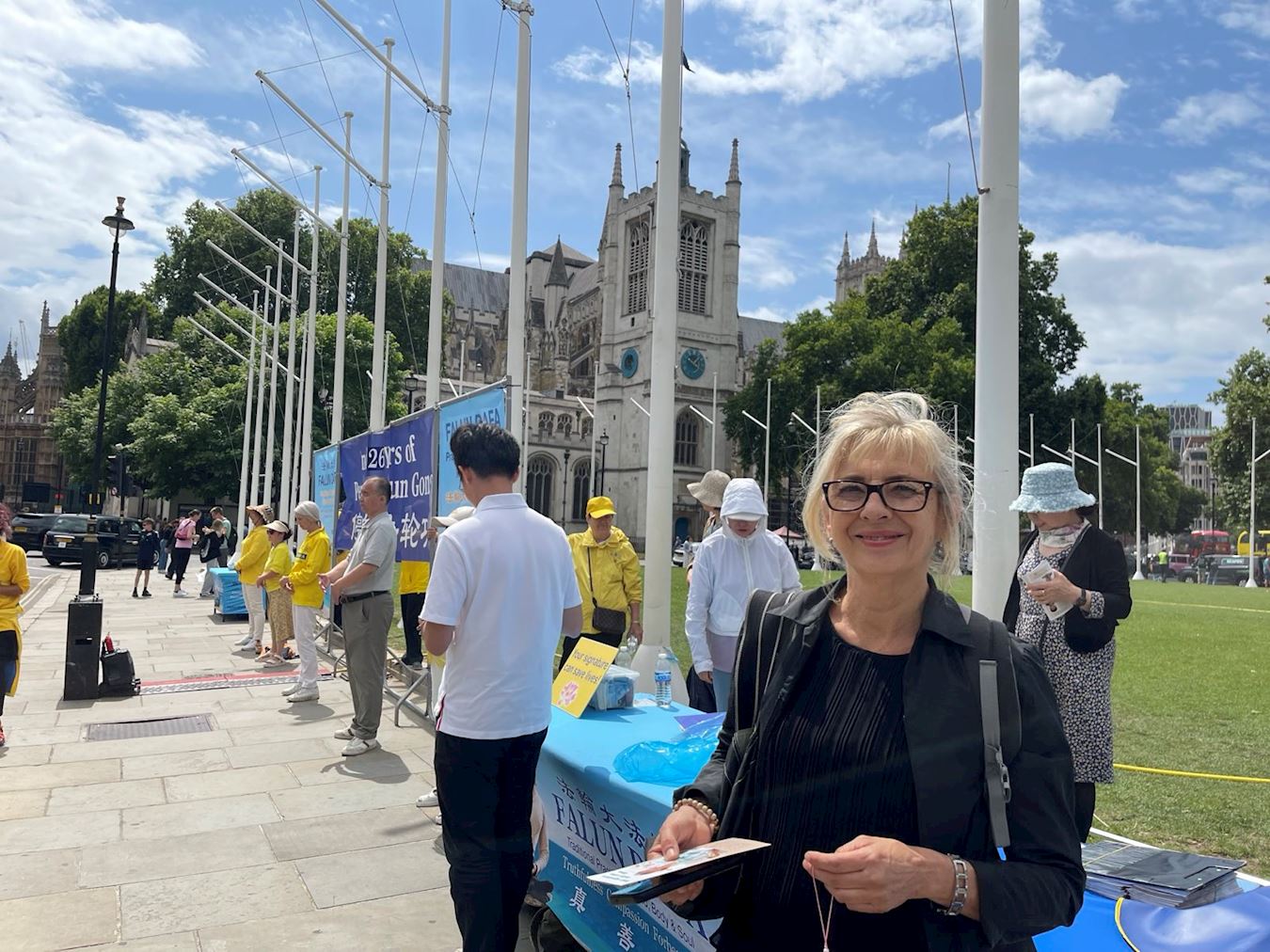 來自法國的遊客凱瑟琳女士毫不猶豫地在徵簽表上簽下名字。她說:「真、善、忍是這個世界非常需要的價值觀。信仰自由人人應有,善良與互助是人類社會的基石。」