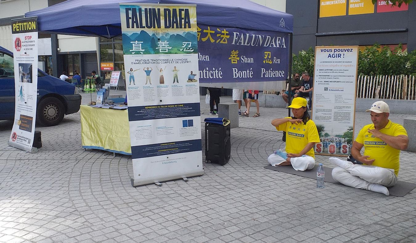 二零二五年七月十二日星期六,來自法國西部的法輪功學員首次在利摩日的共和國廣場舉辦法輪功信息日,他們展開了橫幅、擺放展板,分發傳單,向人們介紹法輪大法以及在中國發生的迫害,並徵集簽名,反對中共迫害。