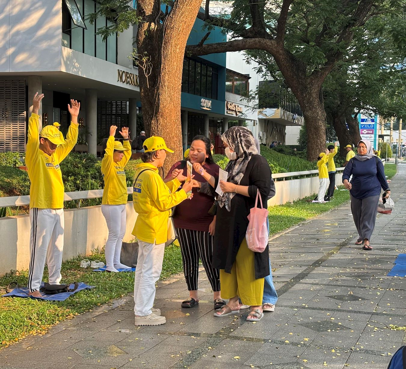 在活動現場,一位來自在附近工作的外籍人士觀看了法輪功學員的活動,他對印尼也有法輪功修煉者感到驚訝,他支持學員們舉辦和平集會,他說:「看到學員們在這裏煉功,我感到很驚訝。我不知道這個國家也有法輪大法。」