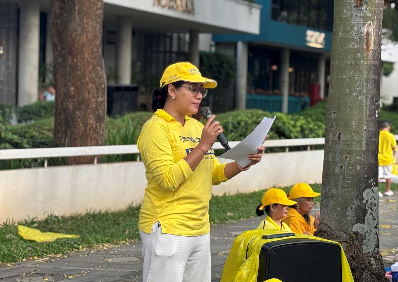 印尼法輪大法學會發言人薩斯特拉尼(Sastrani)女士在集會中說:「中共不僅在中國迫害法輪功超過二十六年,還濫用其外交渠道和國家資金在全球範圍內收買影響力。它利用海外媒體和社交媒體傳播虛假信息,對法輪功及其創始人進行誹謗,目的是放大虛假信息並壓制真相。」