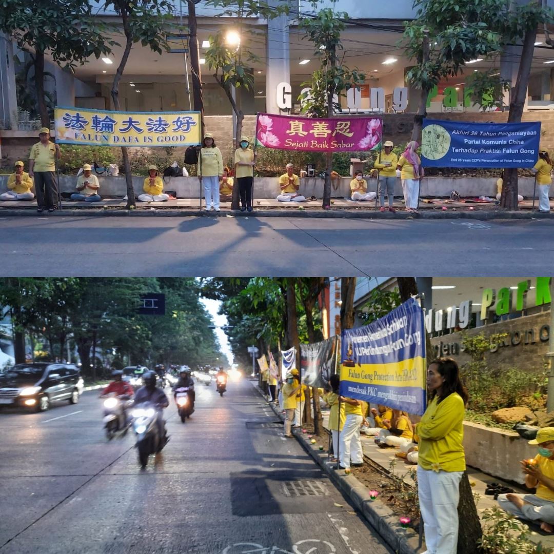 雅加達法輪功學員在中共大使館前舉行集會和燭光守夜活動,呼籲中共立即停止迫害。當天的活動以集體煉功開始,吸引了許多路人駐足觀看。學員向他們贈送真相資料,講述目前仍然在中國發生的嚴重侵犯人權的行為。人們稱讚法輪功學員尋求正義和講述真相的方式是和平和有尊嚴的。