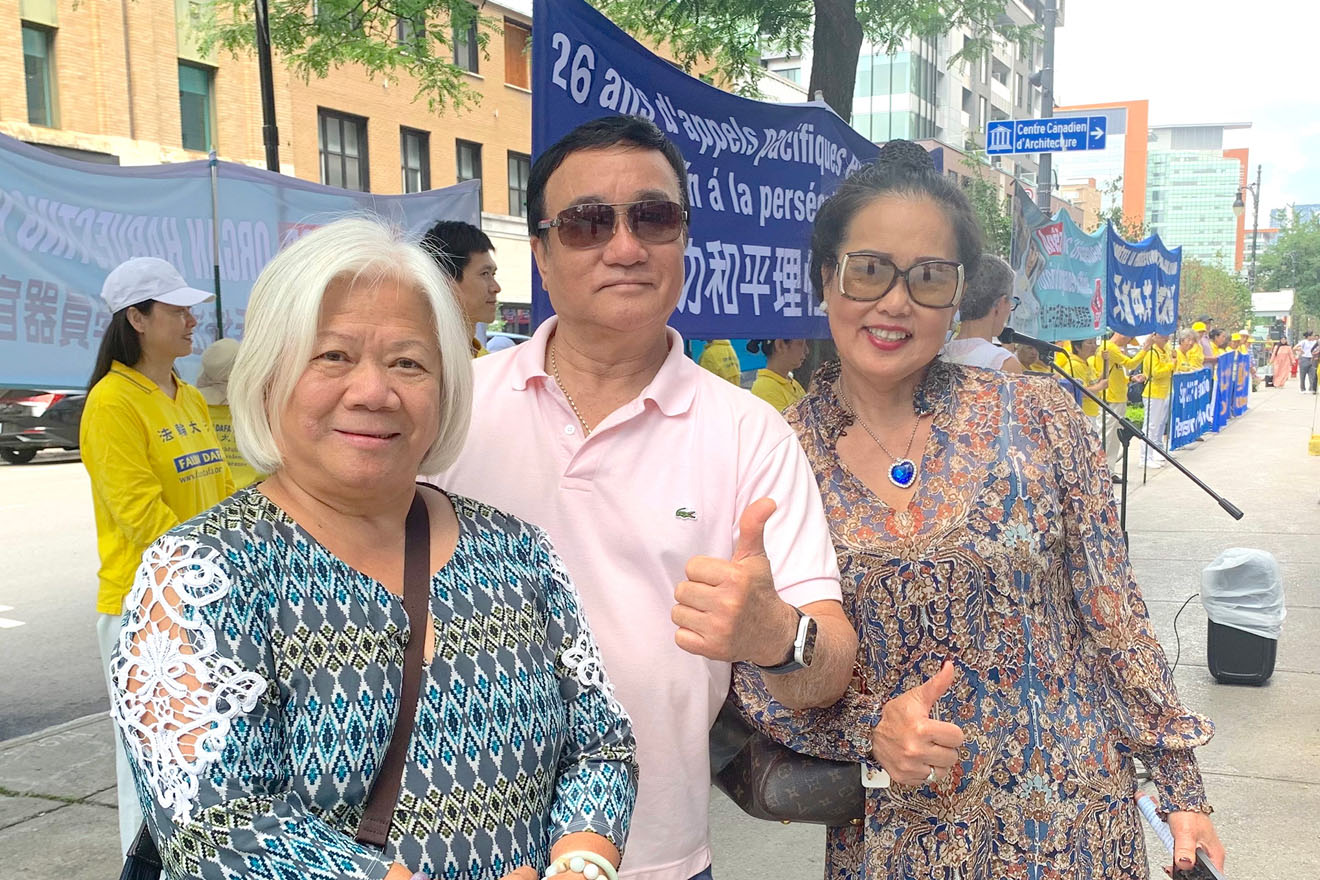 三位越南僑民在現場觀看,直到活動結束。丹女士(Thi Dan Dan)表示,看到法輪功學員反迫害,很受鼓舞。她說,她的丈夫是一名醫生,曾被越共關進集中營洗腦,為逃避共產黨迫害,全家人在上世紀八十年代來到加拿大。
