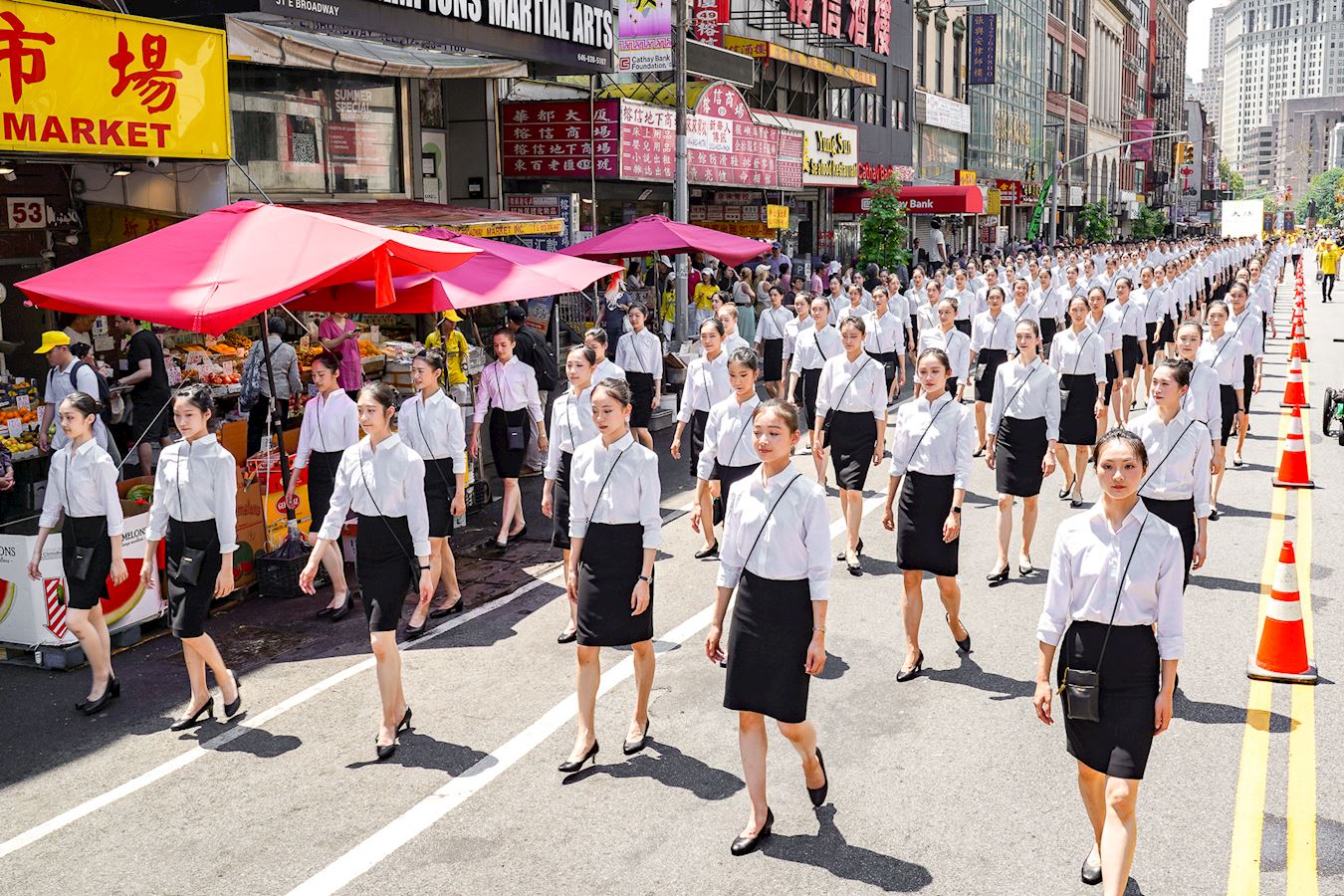 在第一方陣中,人們驚喜的看到,數百位神韻藝術家們卸下舞台華服,換上了俐落的白襯衣黑裙褲,神采奕奕、英姿煥發的行進在曼哈頓的大街上。