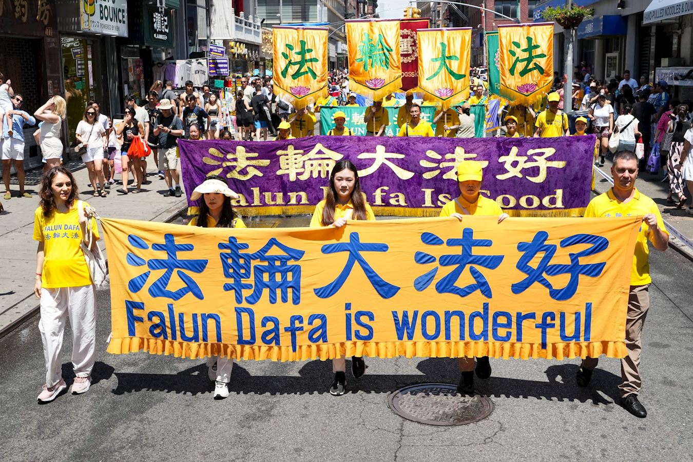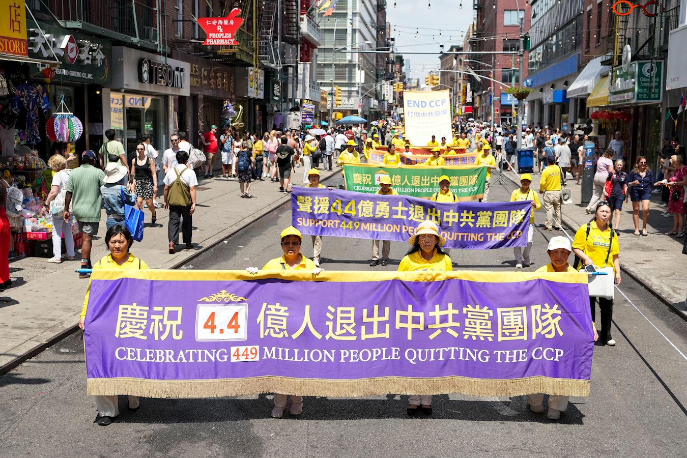 遊行分三個方陣,第一方陣是天國樂團引領的「法輪大法好」。第二方陣是「停止迫害法輪功」。第三方陣由全球退黨中心引領,聲援近4.4億勇士退出中共黨、團、隊組織。神韻的部份演奏家們也加入了今年的天國樂團隊伍,令人耳目一新,壯觀又洪亮。