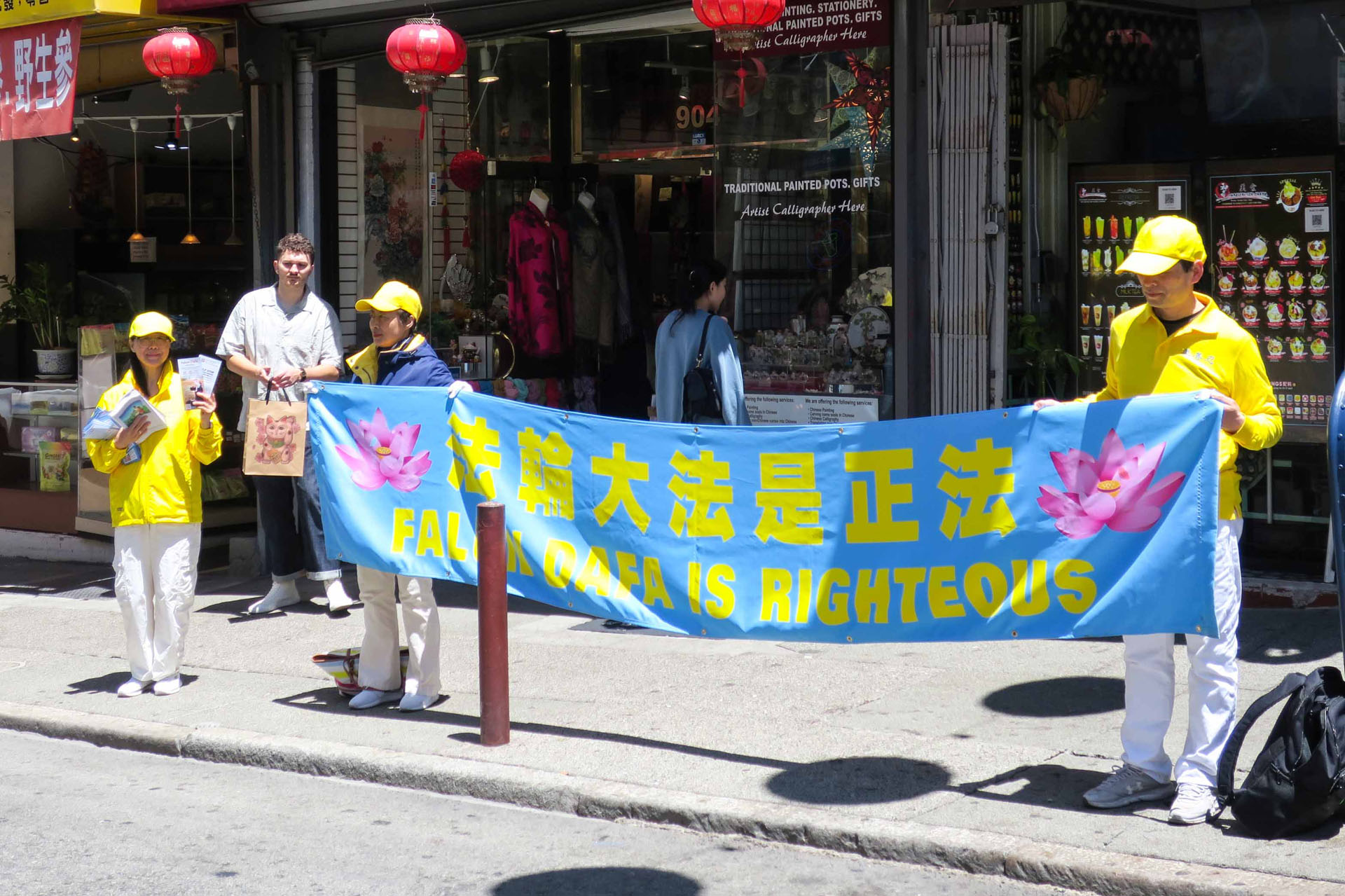 豪威爾女士從猶他州來舊金山看她的女兒,她在唐人街就看到舉辦真相長城的法輪功學員,她說,「我在唐人街看到你們了,我的女兒就住在中領館附近,在這兒我又見到你們了。我跟女兒說:『我要去法輪功那兒,看看我能幫甚麼忙。』」