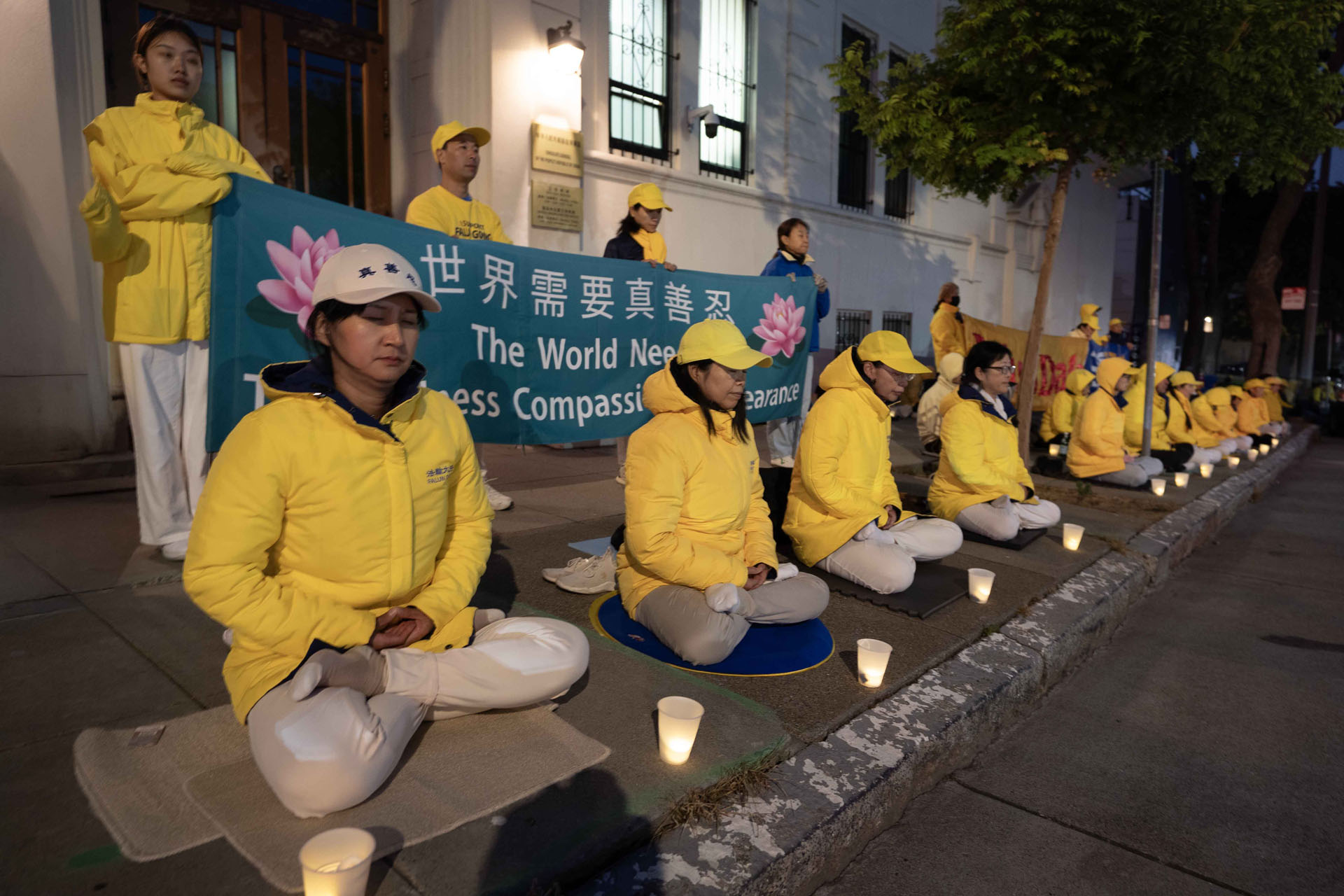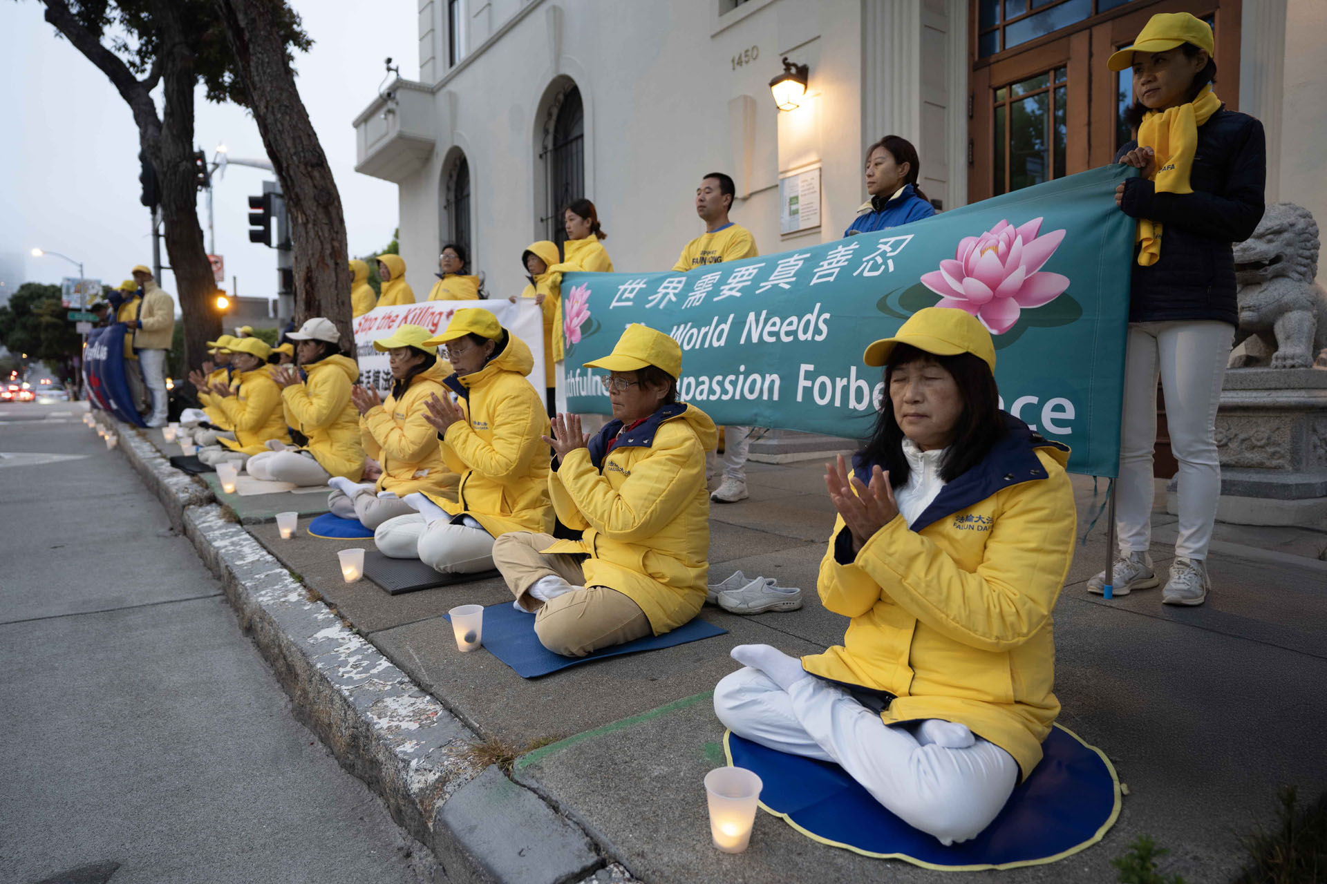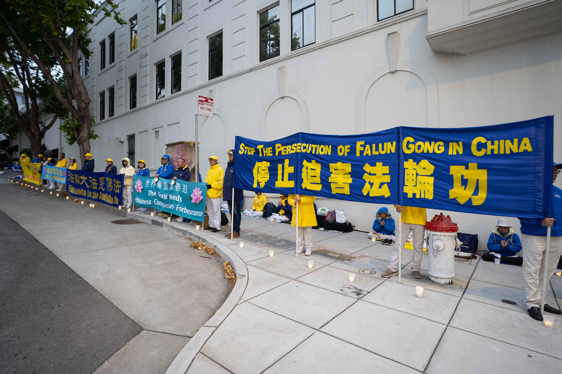 當天晚上,法輪功學員在中領館前舉辦燭光守夜,來自猶他州的希娜﹒豪威爾女士(Sena Hower)對法輪功學員說,「如果你們累了,我可以幫助你們舉橫幅。」