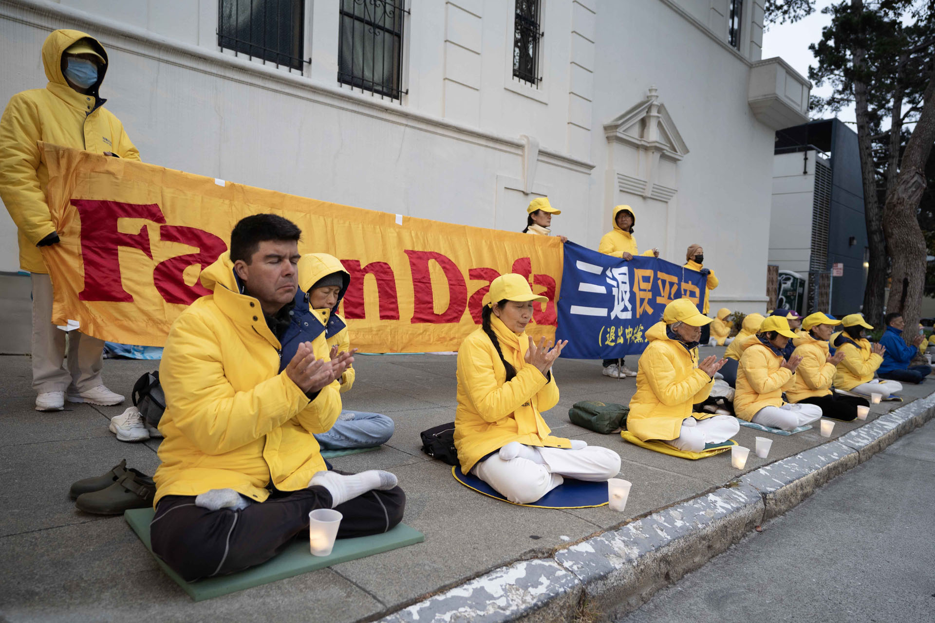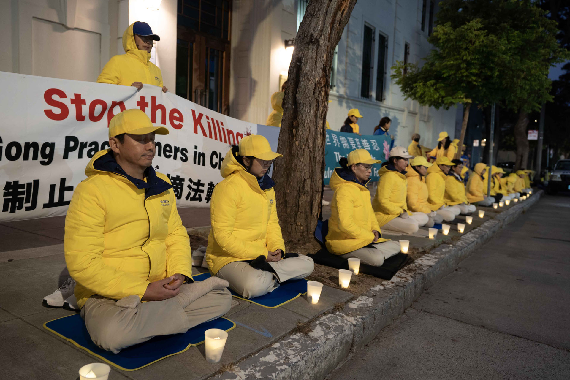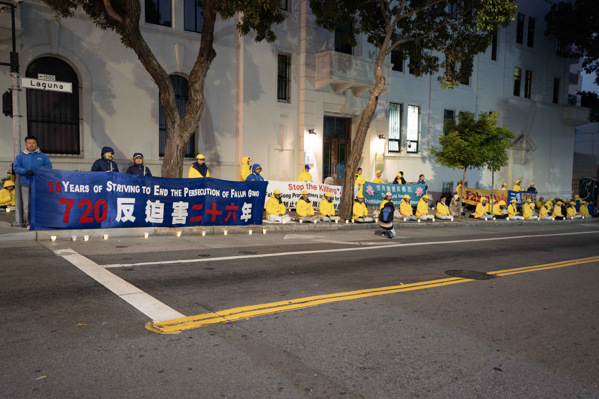 當天晚上,法輪功學員在中領館前舉辦燭光守夜,來自猶他州的希娜﹒豪威爾女士(Sena Hower)對法輪功學員說,「如果你們累了,我可以幫助你們舉橫幅。」