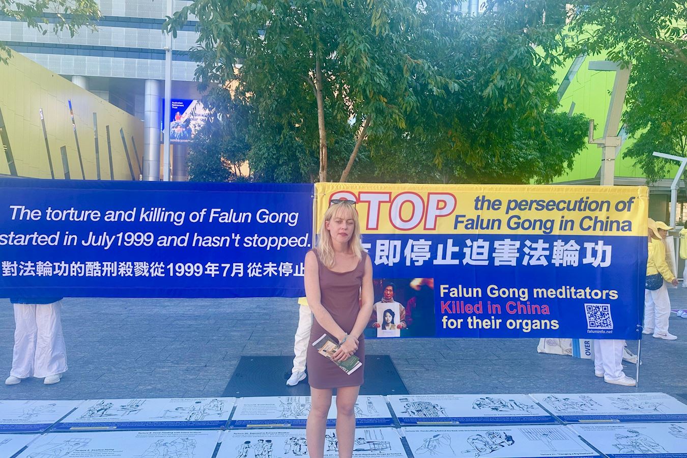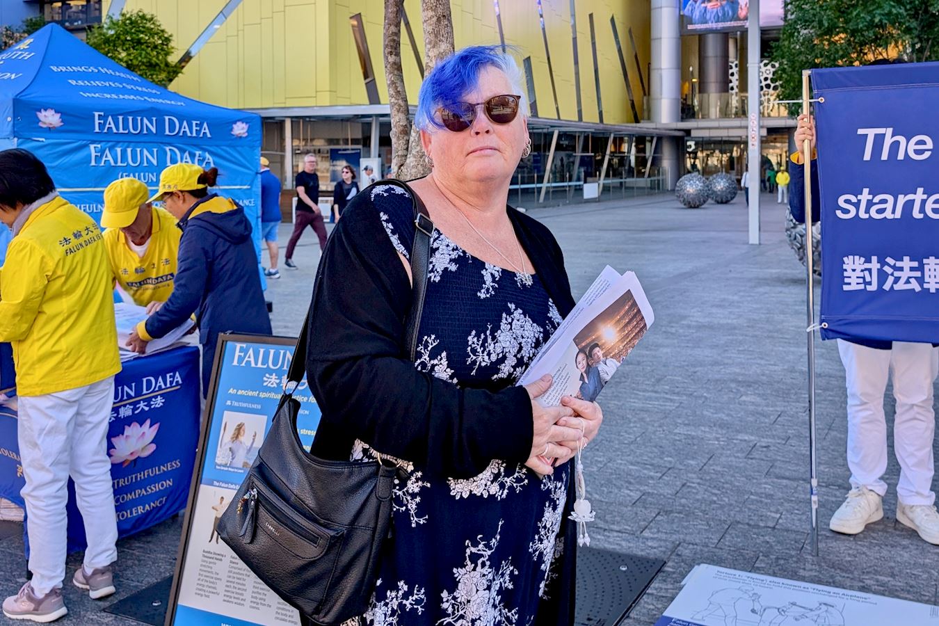 凱倫﹒唐納森(Karen Donaldson)是退休的殘疾護理員,她和朋友在布里斯班廣場散步時,被學員平靜的功法展示所吸引。走近後看到關於活摘器官和二十六年反迫害的橫幅,感到觸目驚心。