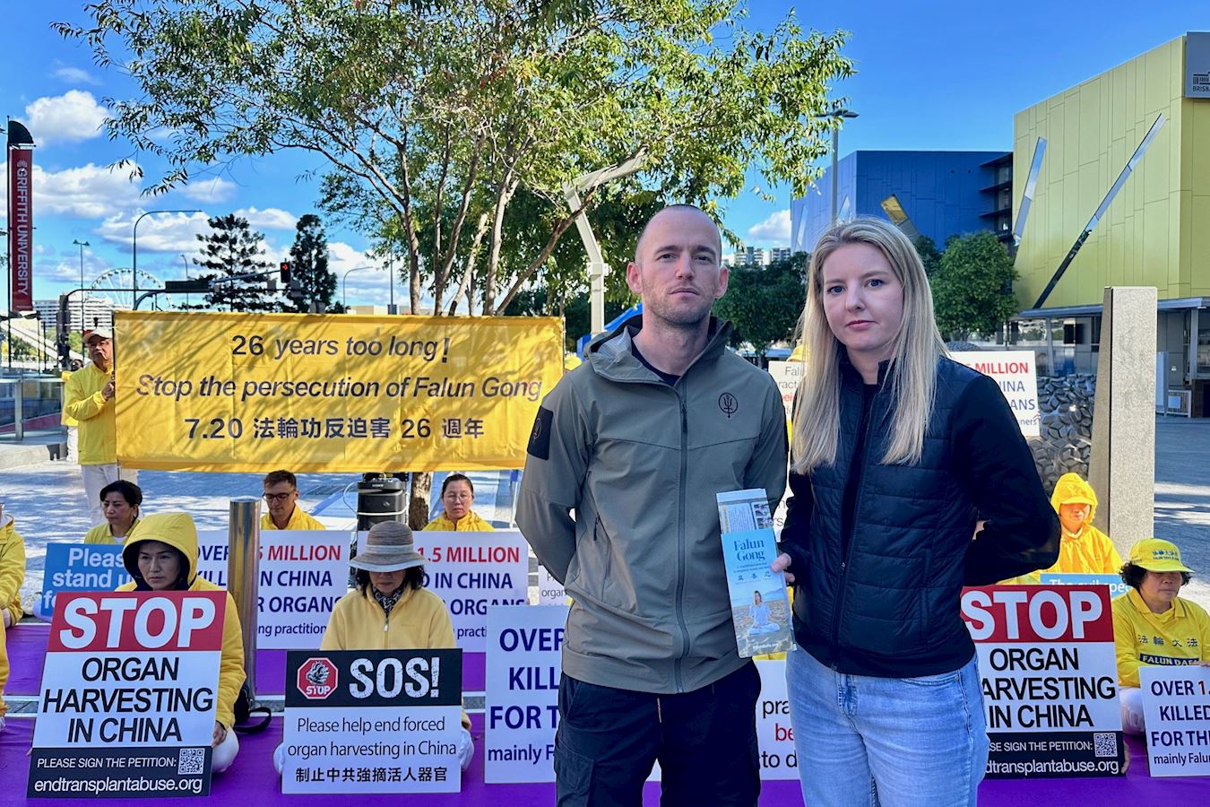 凱蒂(Katie)和丹尼(Danny)是來自昆士蘭陽光海岸的一對情侶,他們是理療醫師。他們被排列整齊、舉牌靜坐的法輪功學員所吸引,來到真相展位前了解真相。