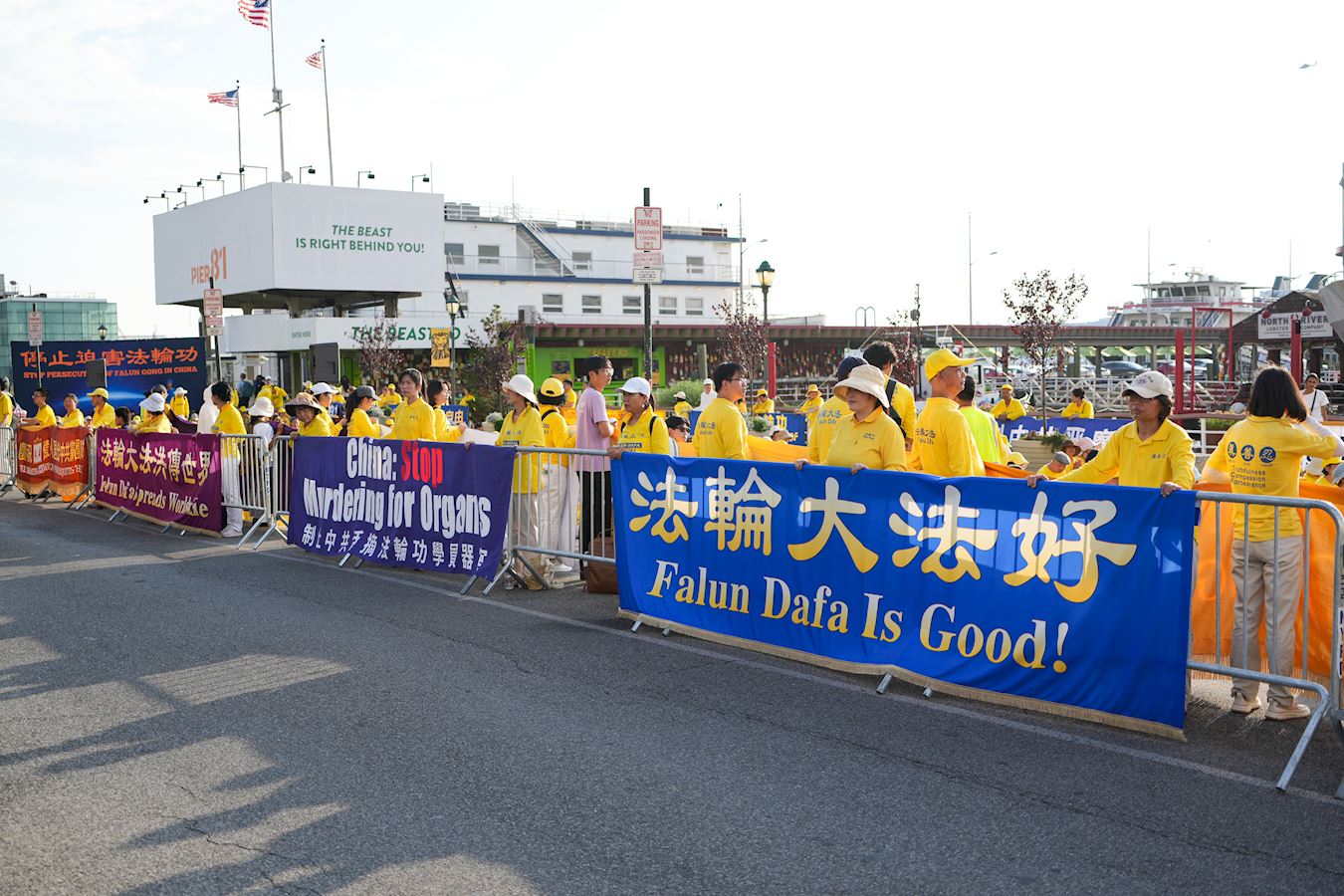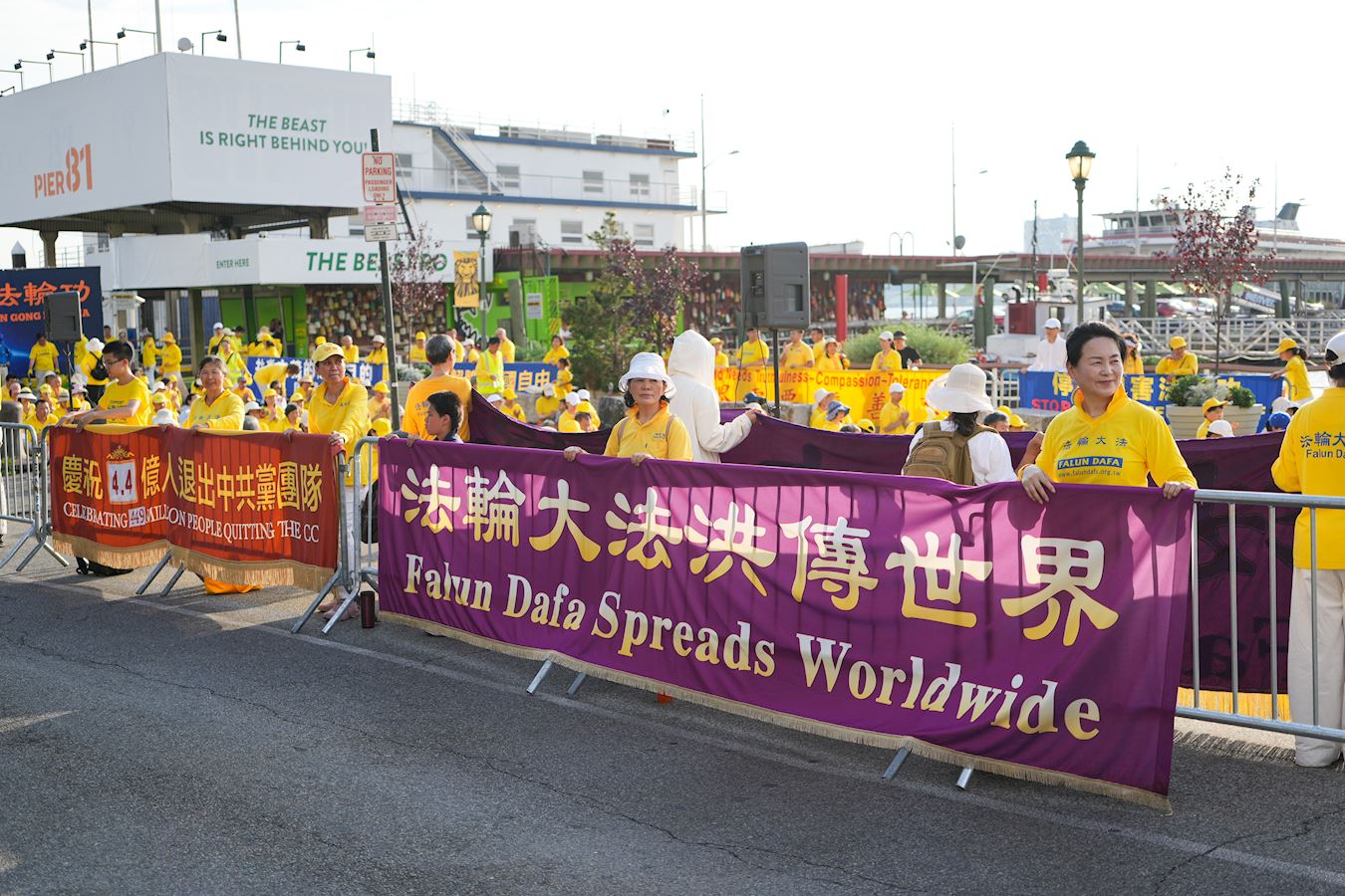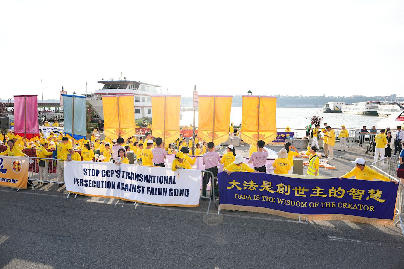 哈德遜河畔,行人絡繹不絕,人們被眼前感人的場面所吸引,紛紛停下腳步。有的拍照,有的接過傳單,有的與法輪功學員交談,了解在中國發生的群體滅絕式的人權迫害,不少人在制止迫害的徵簽板上簽下名字。