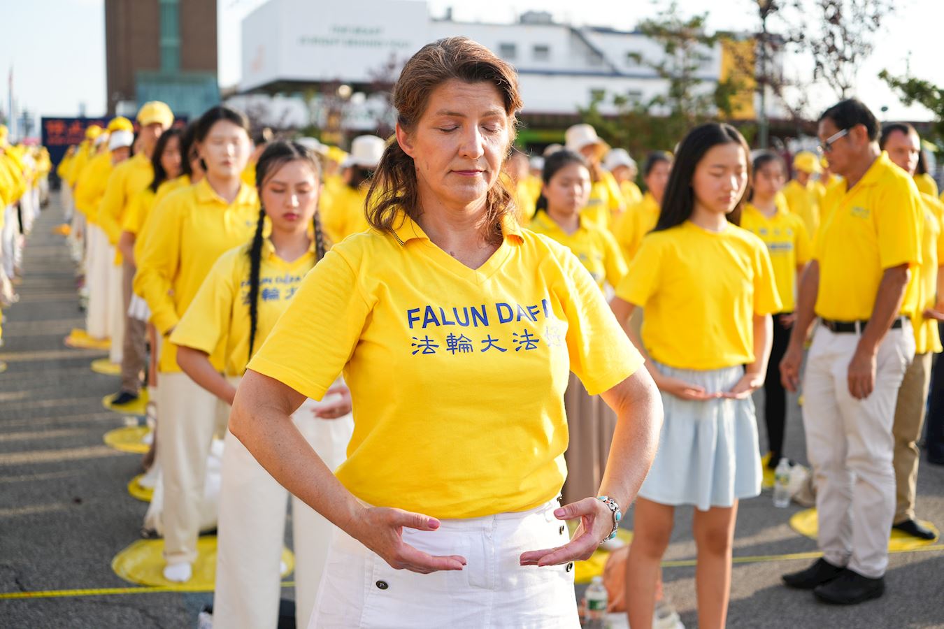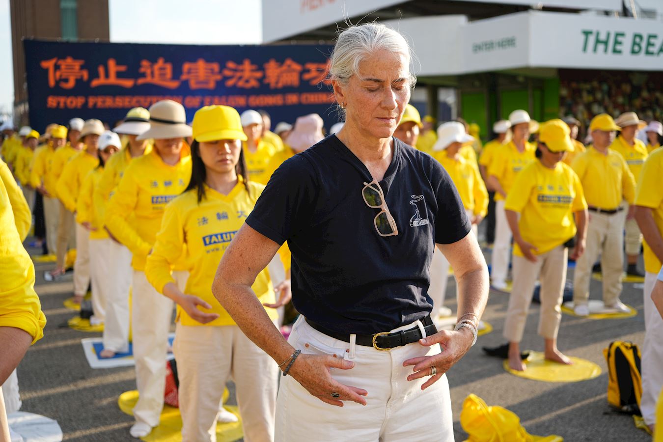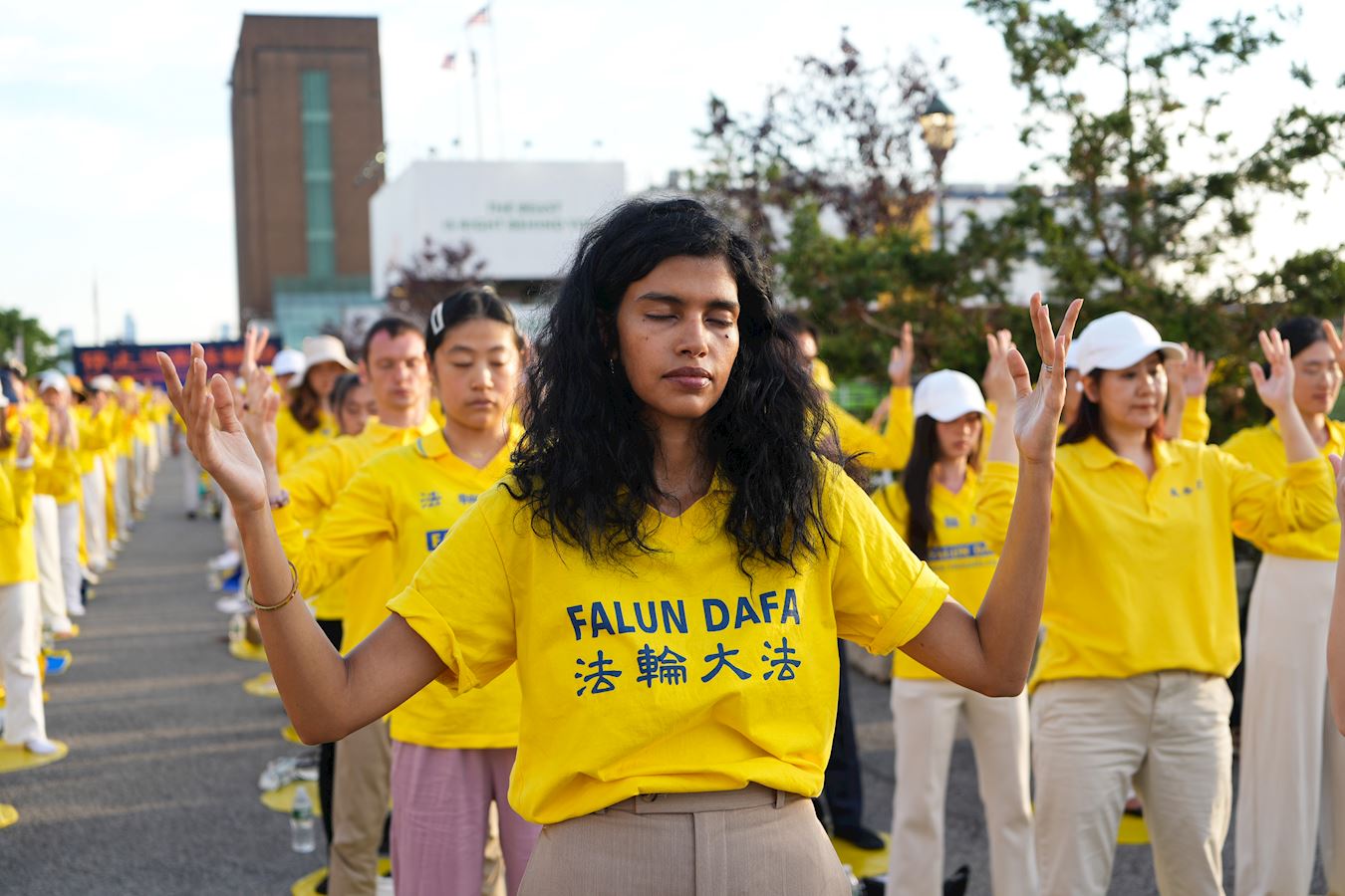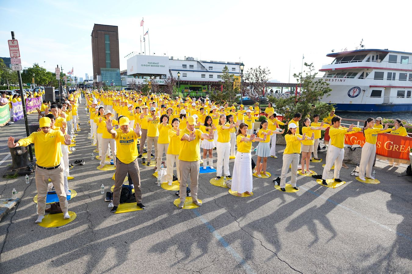 哈德遜河畔,行人絡繹不絕,人們被眼前感人的場面所吸引,紛紛停下腳步。有的拍照,有的接過傳單,有的與法輪功學員交談,了解在中國發生的群體滅絕式的人權迫害,不少人在制止迫害的徵簽板上簽下名字。