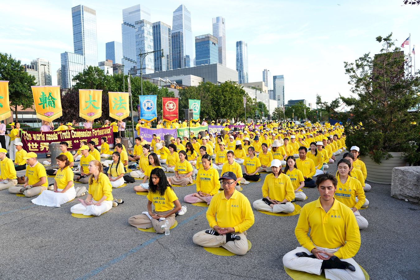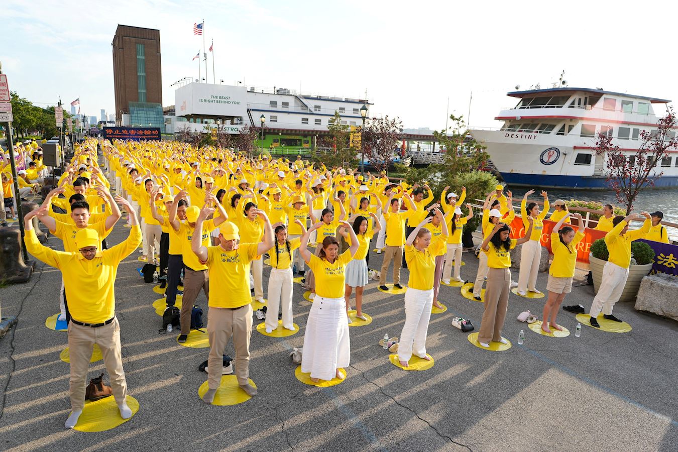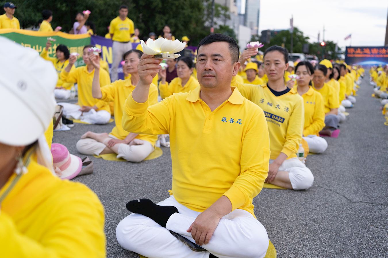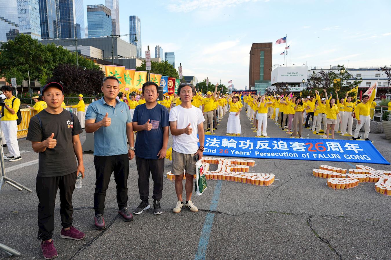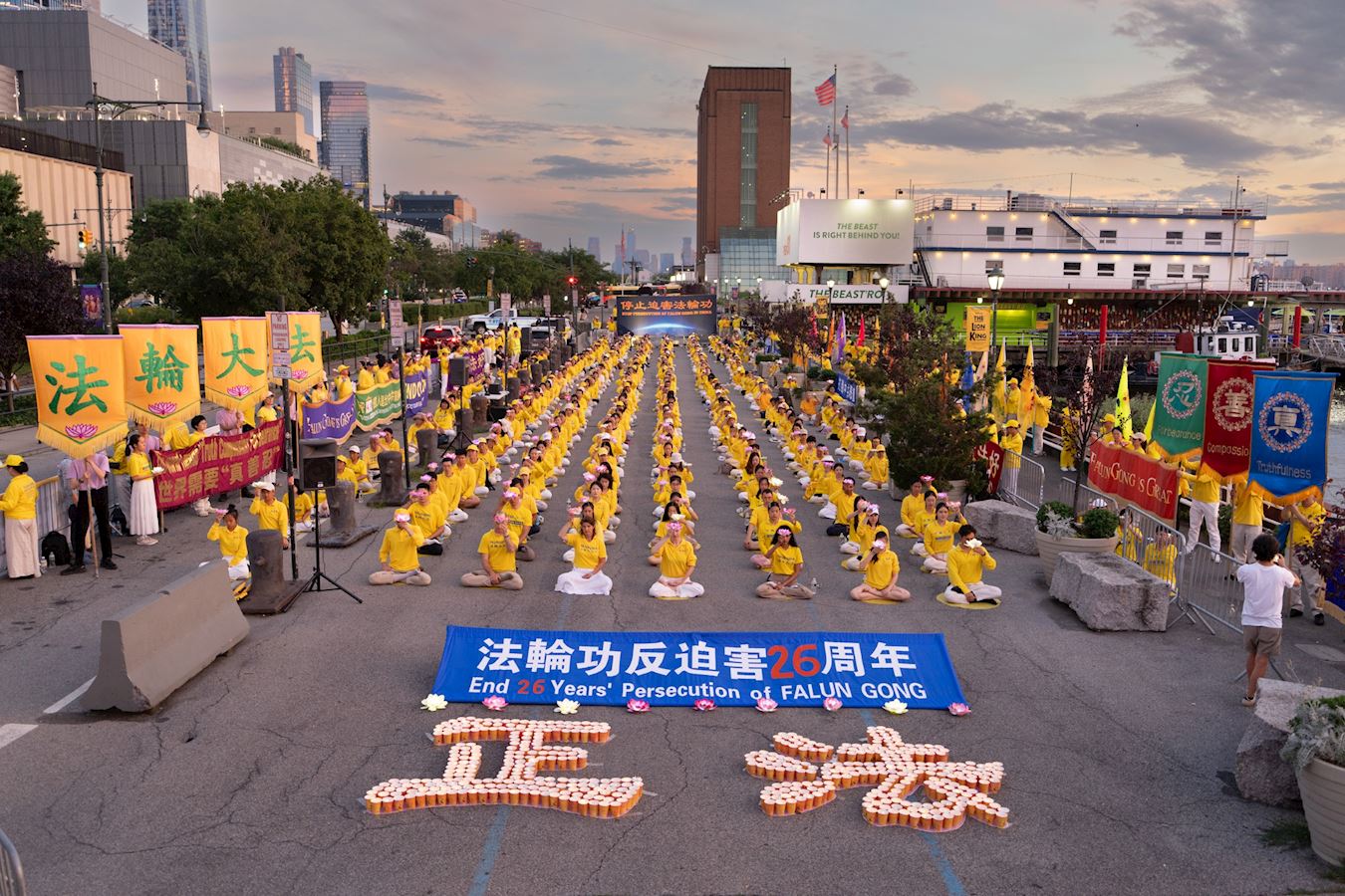 【明慧網二零二五年七月二十三日】二零二五年七月二十日傍晚,紐約部份法輪功學員在中共駐紐約領事館對面的哈德遜河畔,舉行燭光夜悼,悼念二十六年來被中共迫害離世的法輪功學員,呼喚正義良知,要求中共停止迫害。 來自不同族裔、不同年齡的法輪功學員們用橫幅築起一道道「真相長城」:「法輪大法」「 真、善、忍」「停止迫害法輪功」「制止中共活摘法輪功學員器官」「打倒中共惡魔」「慶祝4.49億人退出中共黨團隊」「法輪大法洪傳世界」。同時集體煉功,向過往民眾展示平和的法輪功功法,講述法輪功真相。