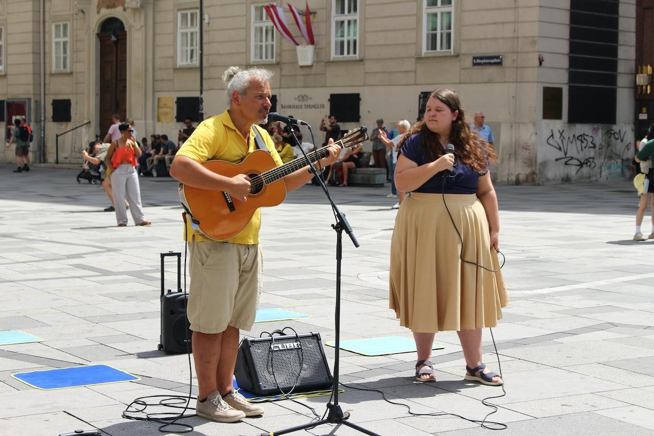 活動期間,兩位學員用歌聲表達了他們對法輪大法的熱愛以及對迫害仍在繼續的悲傷,路人深受感動。