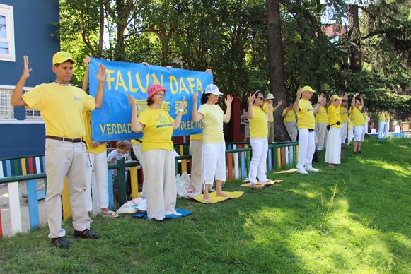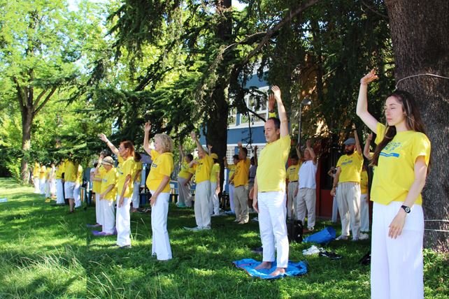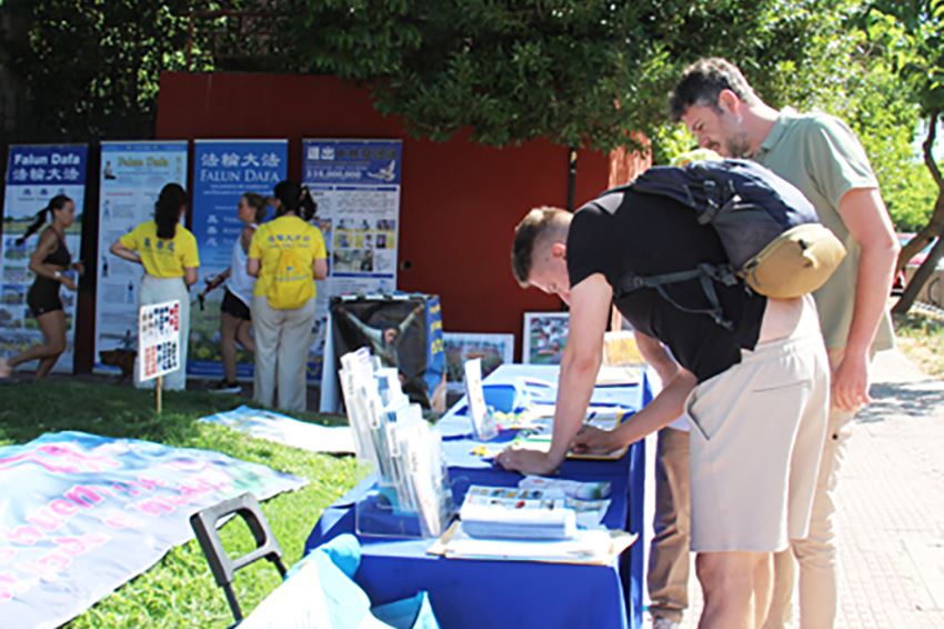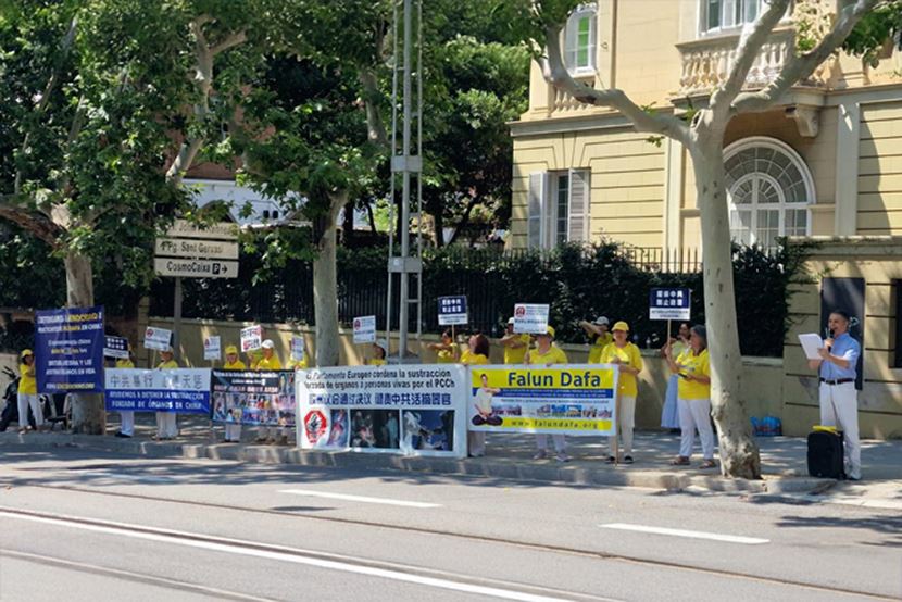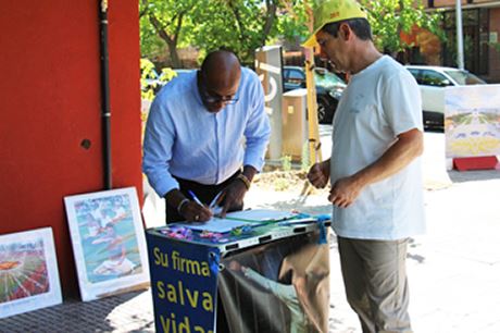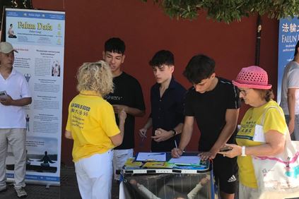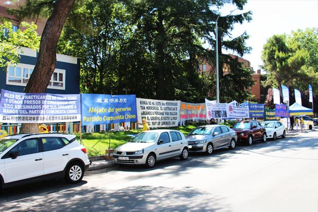 在馬德裏和巴塞羅那中使領館前,法輪功學員靜靜地舉著橫幅,一面面醒目的橫幅、標語牌、真相圖板和傳單都在告知世人中共侵犯信仰自由、非法關押、酷刑折磨甚至活摘器官、殘暴迫害法輪功學員的種種罪惡行徑。同時法輪功學員通過展示優美舒緩的法輪功五套功法向人們傳遞著法輪大法的美好。