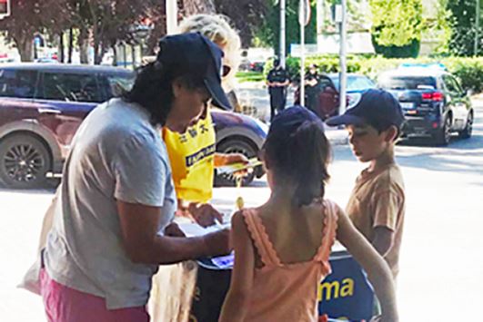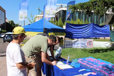 伊利婭(Iria)女士和她的兩個孩子經過集會場地,在了解法輪功真相後,立刻簽名表示對中共的譴責和對法輪功學員反迫害的支持。她說:「希望早日推翻中國共產黨,願中國人得到信仰自由!」