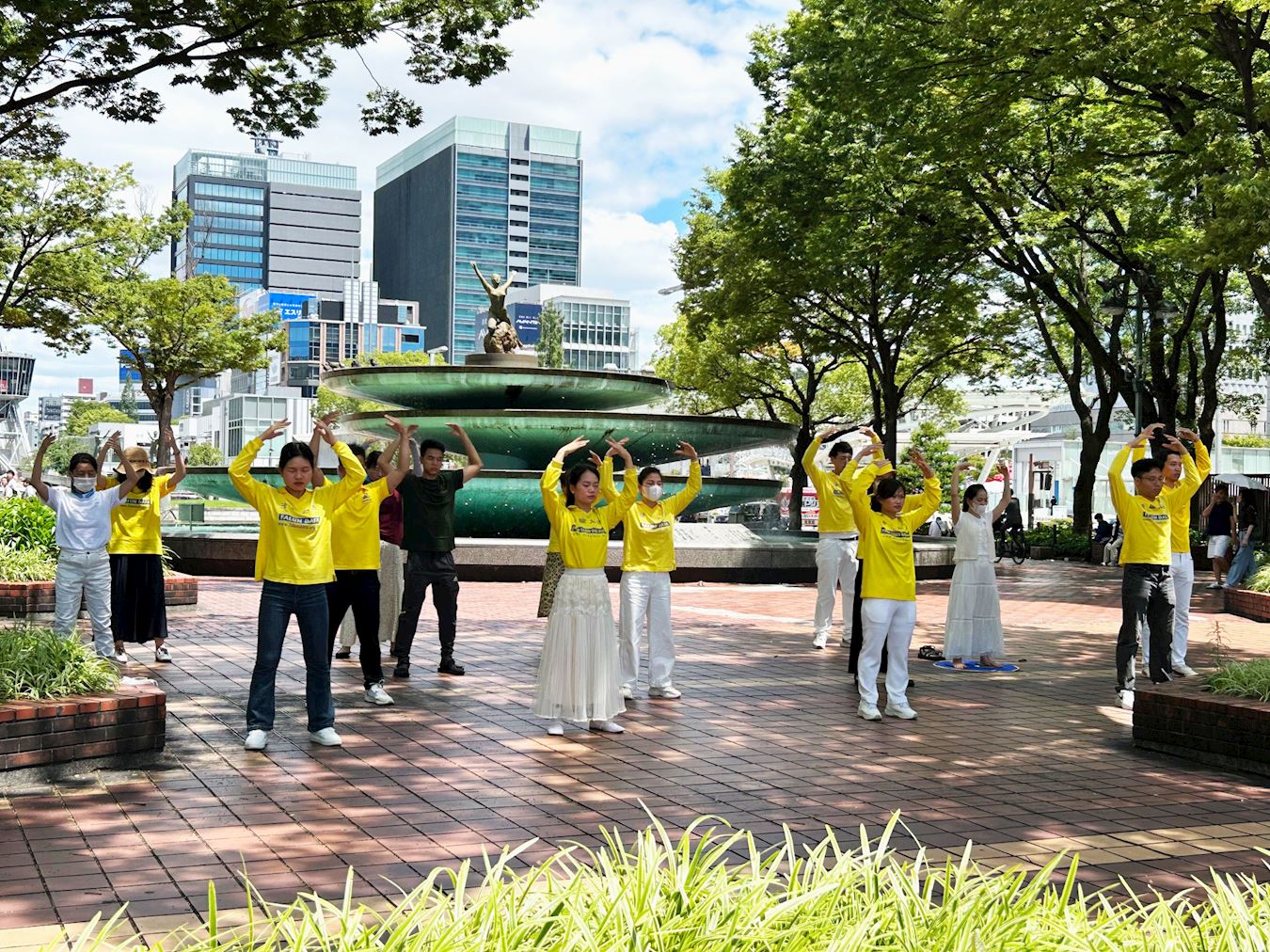 ![]() 圖1~2:二零二五年七月二十日,法輪功學員們在名古屋市「榮」噴水附近煉法輪功的五套功法 |