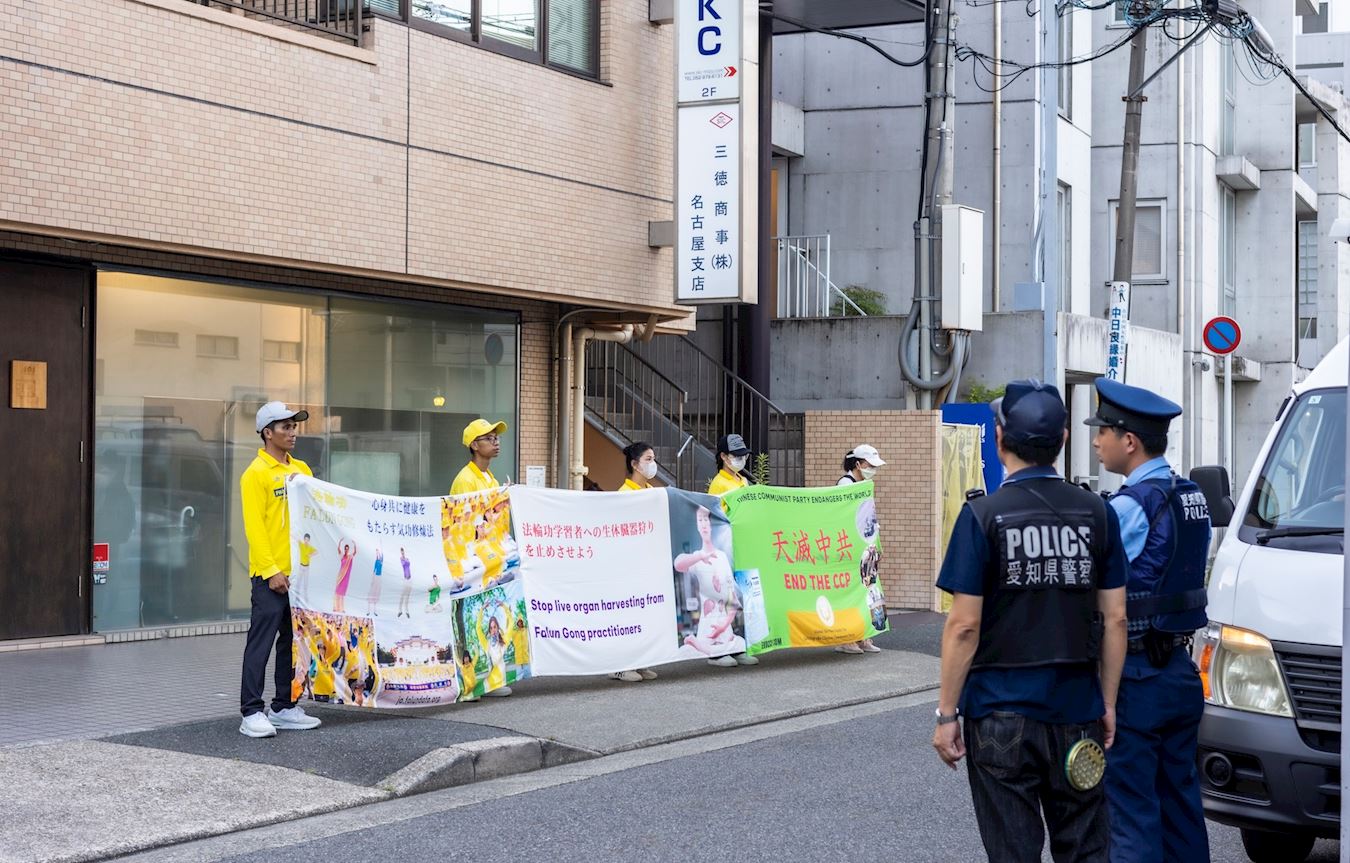 當天傍晚,法輪功學員們也去名古屋中領館前繼續舉行反迫害的和平抗議。他們手持橫幅,呼籲:停止對法輪功學員的活摘器官暴行,要求中共立即停止迫害。