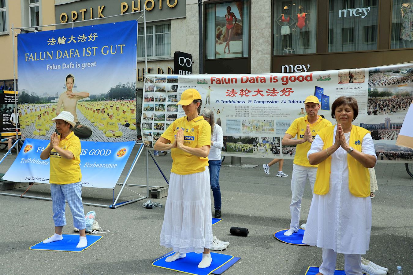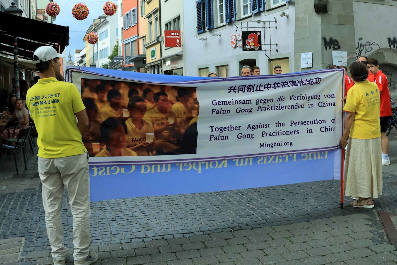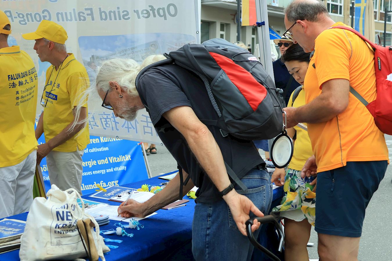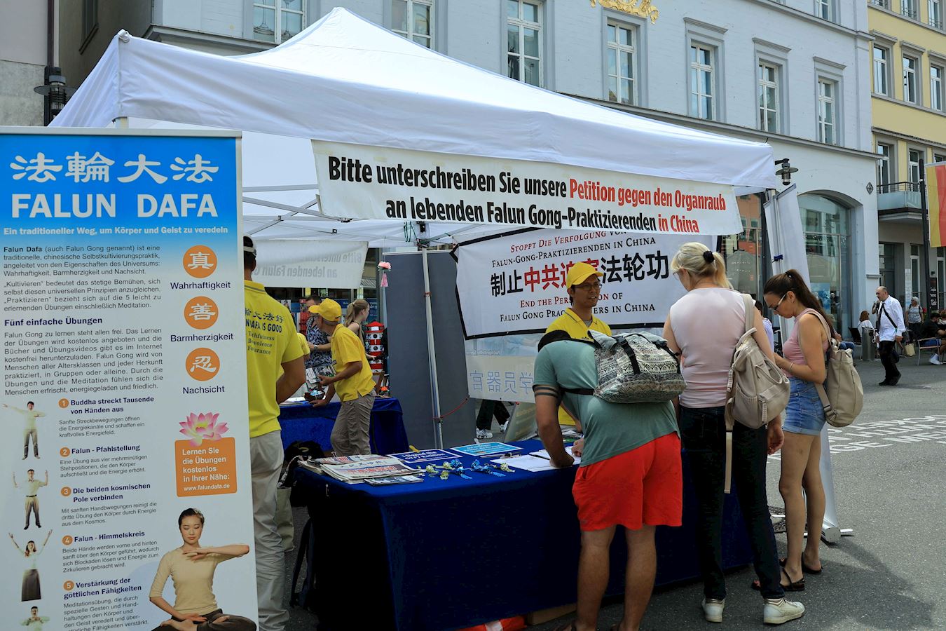 很多人接受法輪功學員遞上的傳單,交談中他們了解到:當天正值法輪功學員反迫害二十六週年之際,德國和瑞士學員通過橫幅及平和的功法演示想告訴大家法輪大法的美好,同時也揭露中共自一九九九年七月二十日以來持續迫害法輪功學員,甚至活摘他們器官,牟取暴利的罪行。還希望能有更多人簽署四份徵簽表,共同要求德國、瑞士及其他多個國家政府採取行動,制止中共迫害法輪功及活摘罪行。