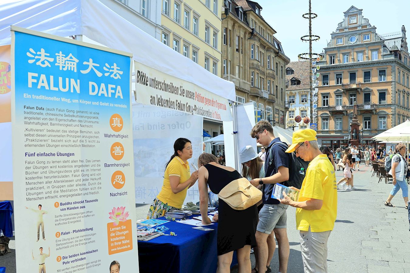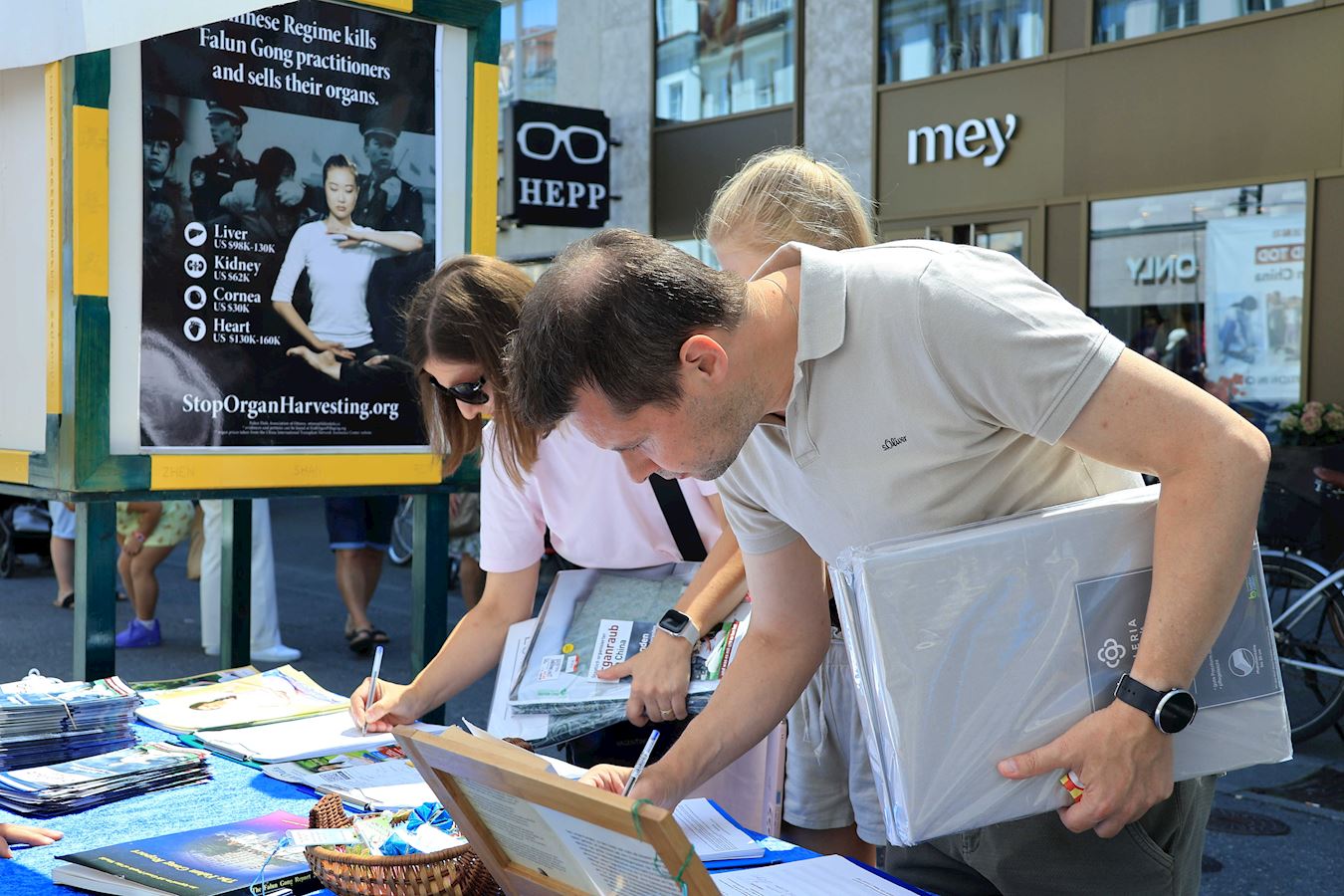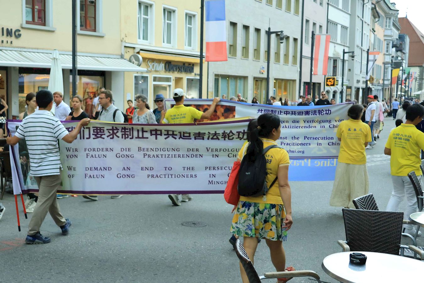 很多人接受法輪功學員遞上的傳單,交談中他們了解到:當天正值法輪功學員反迫害二十六週年之際,德國和瑞士學員通過橫幅及平和的功法演示想告訴大家法輪大法的美好,同時也揭露中共自一九九九年七月二十日以來持續迫害法輪功學員,甚至活摘他們器官,牟取暴利的罪行。還希望能有更多人簽署四份徵簽表,共同要求德國、瑞士及其他多個國家政府採取行動,制止中共迫害法輪功及活摘罪行。
