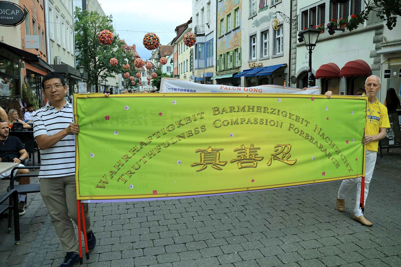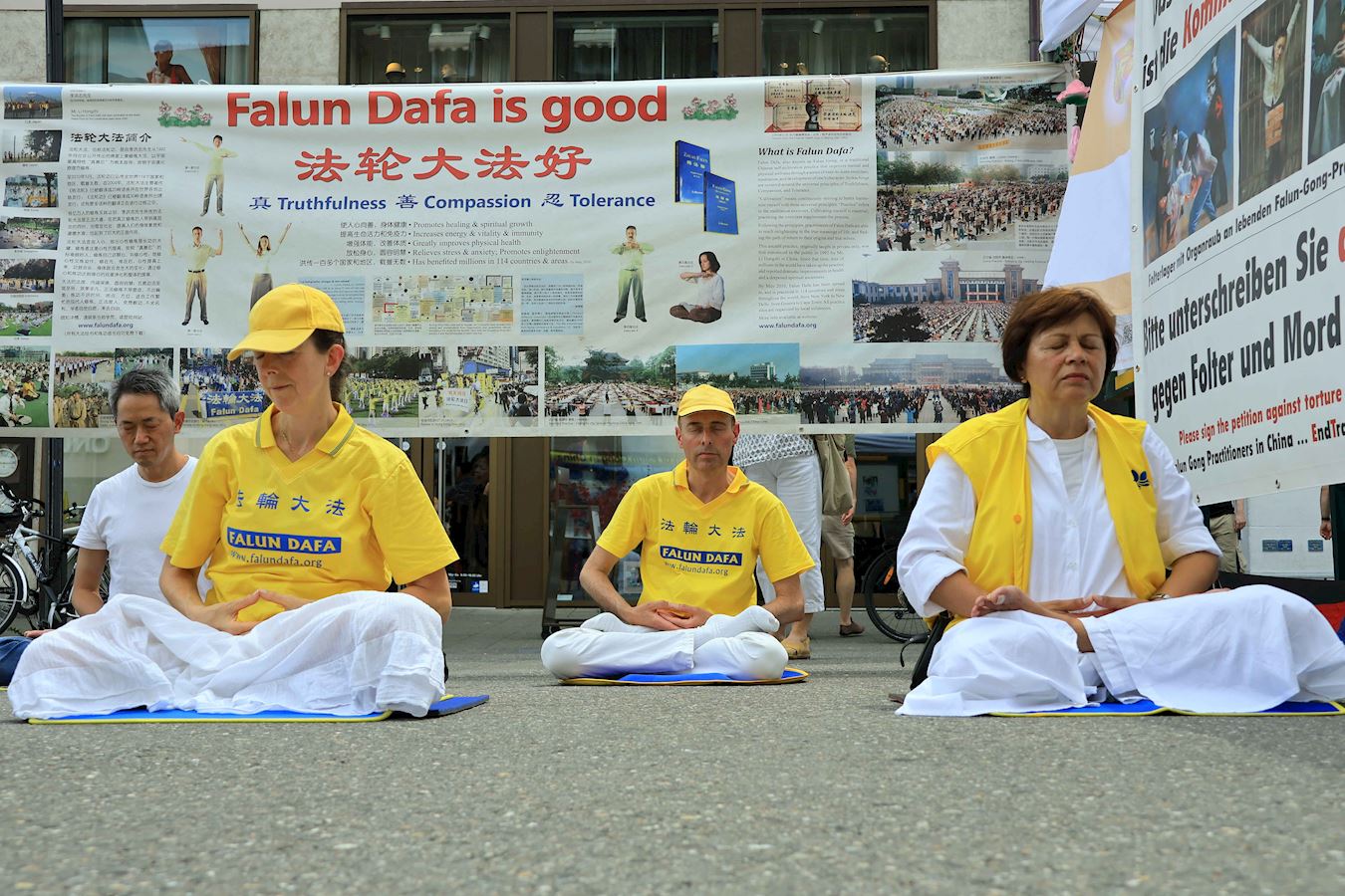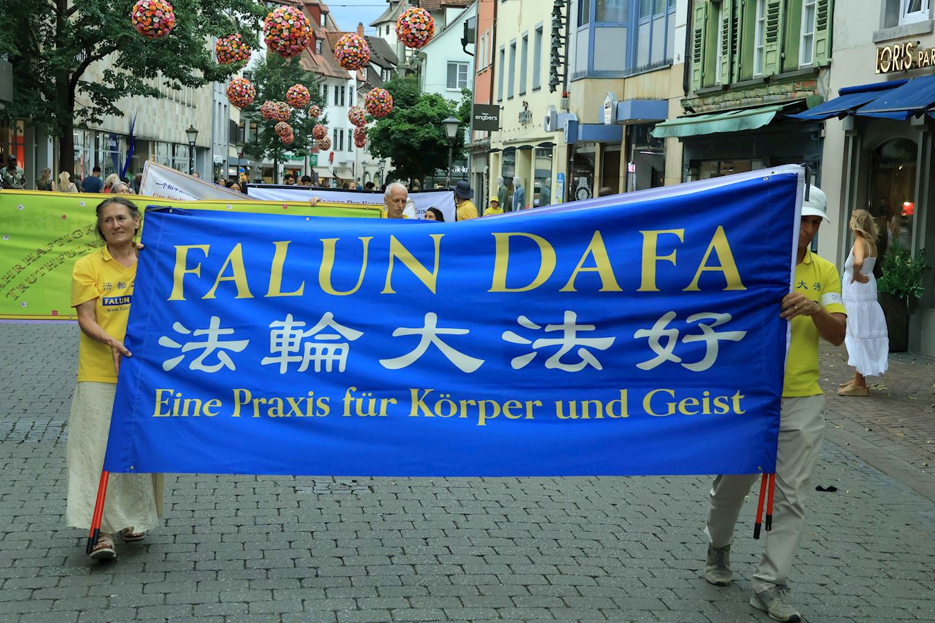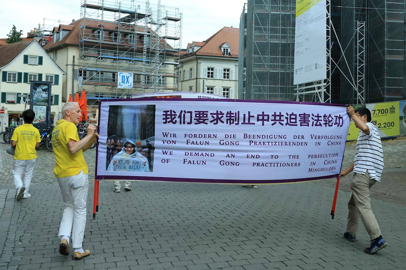 很多人接受法輪功學員遞上的傳單,交談中他們了解到:當天正值法輪功學員反迫害二十六週年之際,德國和瑞士學員通過橫幅及平和的功法演示想告訴大家法輪大法的美好,同時也揭露中共自一九九九年七月二十日以來持續迫害法輪功學員,甚至活摘他們器官,牟取暴利的罪行。還希望能有更多人簽署四份徵簽表,共同要求德國、瑞士及其他多個國家政府採取行動,制止中共迫害法輪功及活摘罪行。