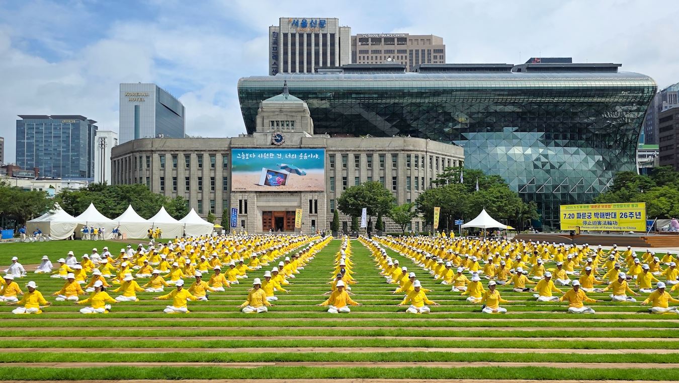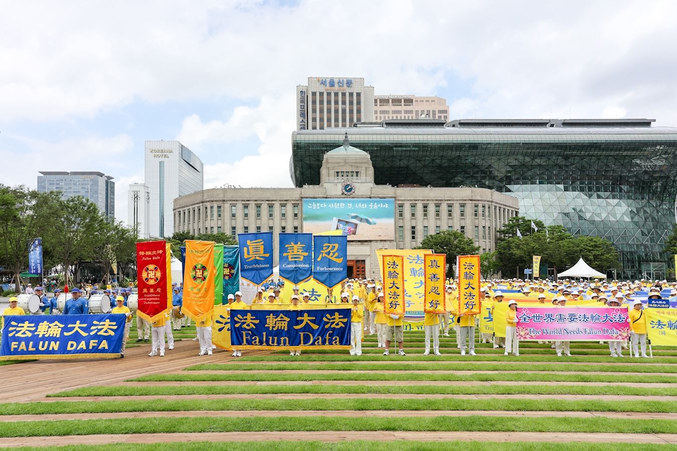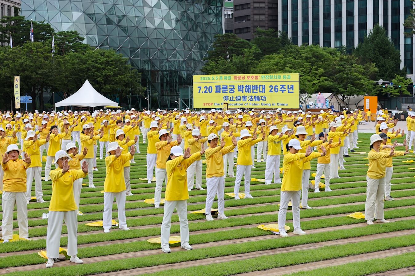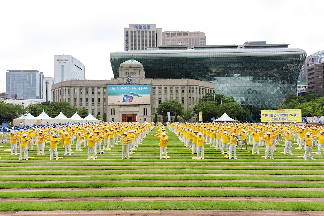 全國各地法輪功學員們聚集在首爾廣場,他們身著黃色上衣、白色褲子,在正式活動開始前進行了約一個半小時的集體煉功展示。由於是早晨時間,不少下榻附近酒店的外國遊客路過時被集體煉功場面吸引,紛紛駐足觀看並用手機拍照。一些路人甚至跟著做煉功動作。