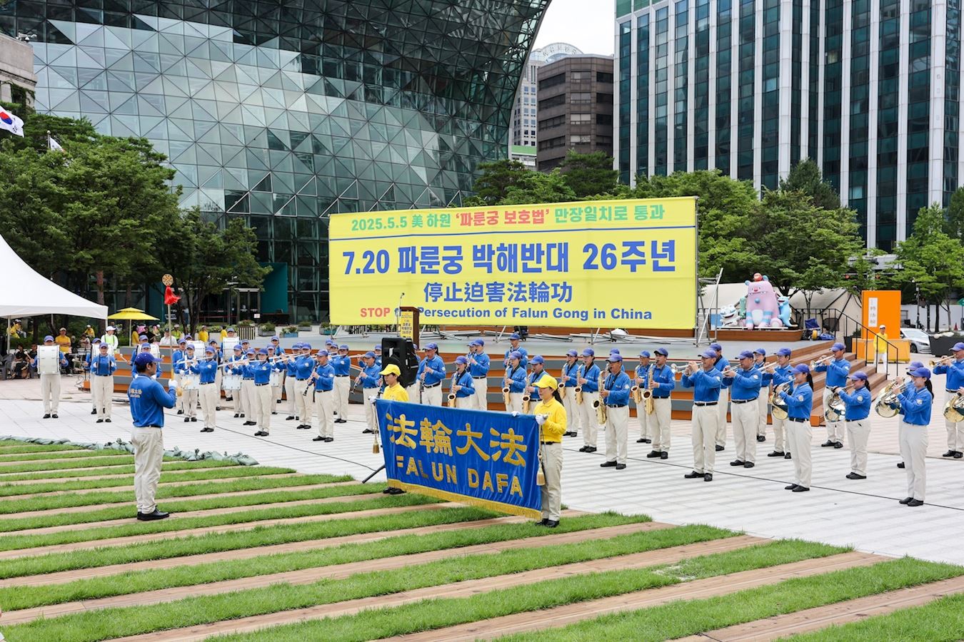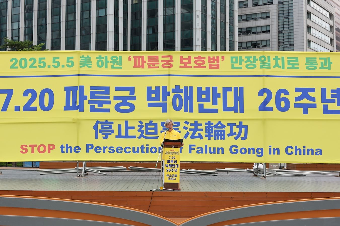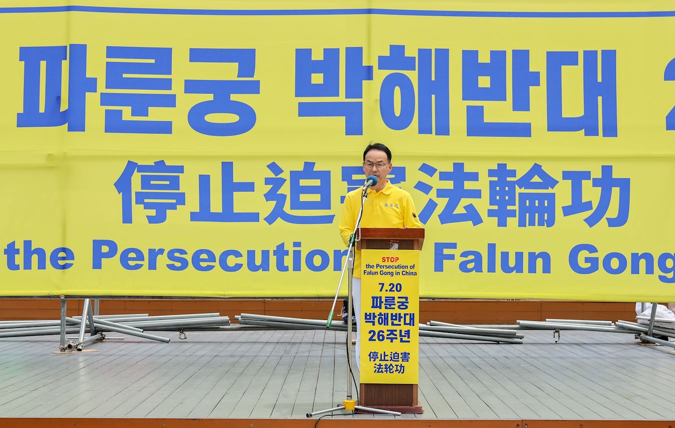 集會上,主持人介紹了「七﹒二零」活動的意義,接著韓國法輪大法佛學會會長權洪大宣讀了「七﹒二零反迫害二十六週年」聲明。