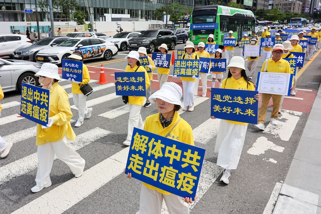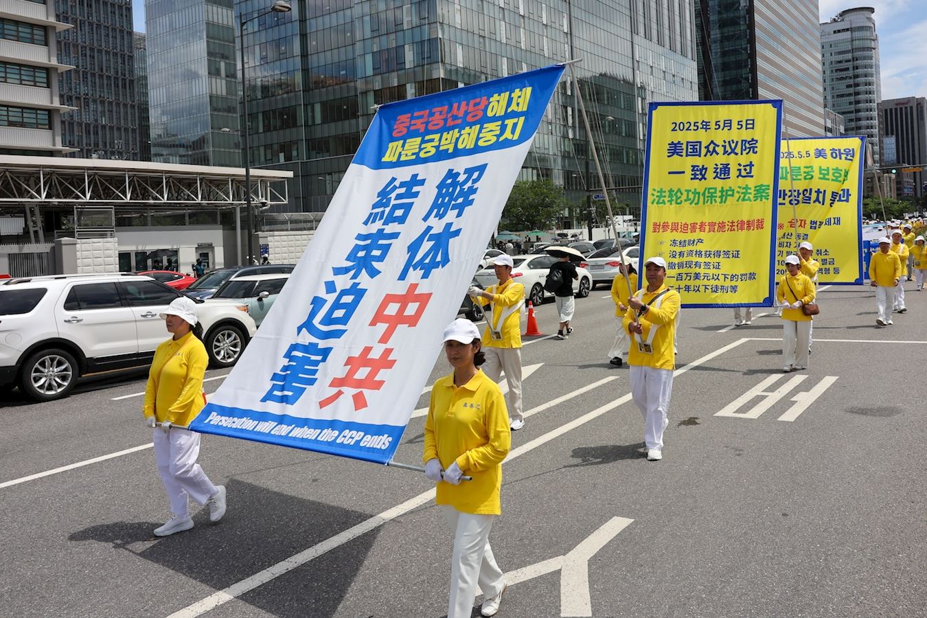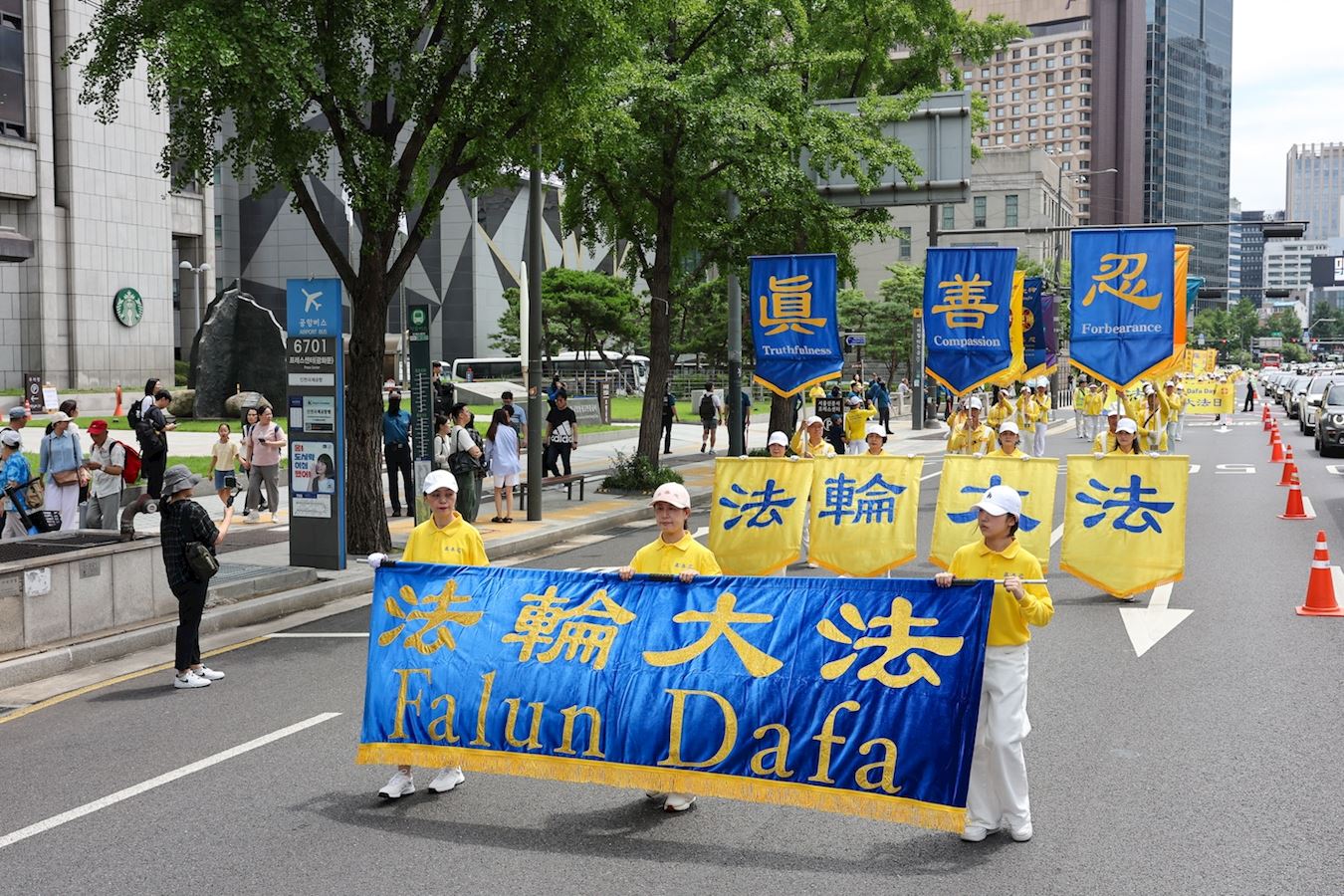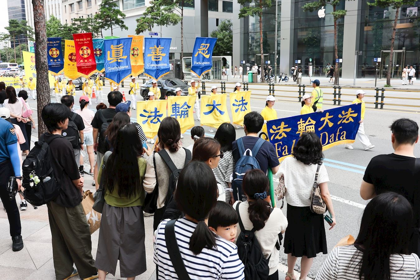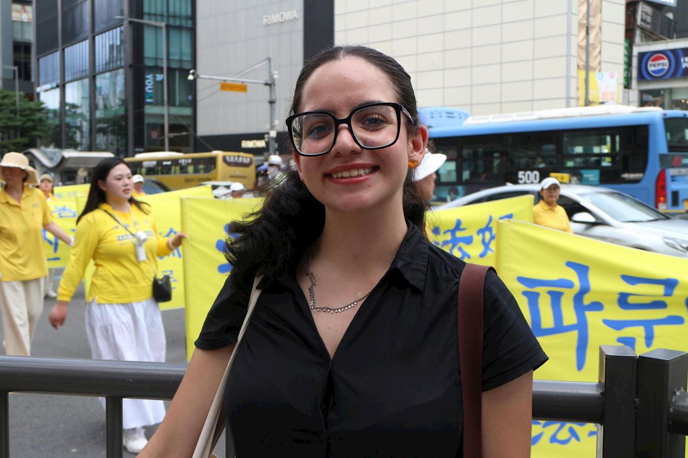 當遊行隊伍經過明洞時,記者遇到來自法國的遊客克洛伊(Chloe)。她表示,堅決反對以任何形式對宗教信仰進行非法迫害,尤其是「強制摘取人體器官」這種行為,絕對無法接受。她說,遊行的整體氣氛非常和平祥和,天國樂團的演奏給她留下了非常積極的印象。
