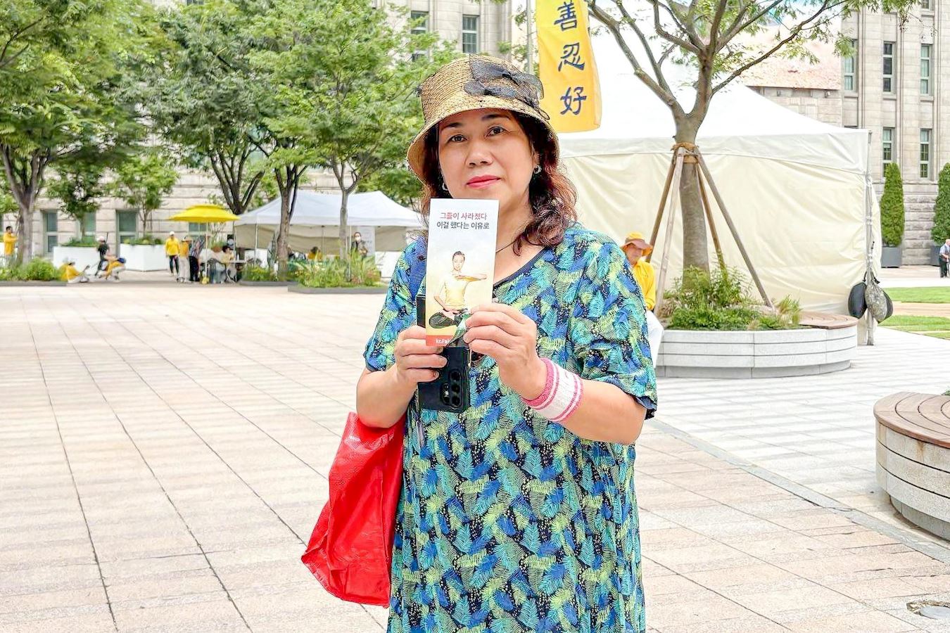 在昌原擔任小學保健教師的偰明子(설명자)女士,自四年前開始修煉法輪功以來,每年都積極參與法輪功反迫害活動。她表示:「自從修煉法輪功後,我覺得有責任向人們傳遞法輪功的真相,因此每年都會參加活動。看到中共犯下如此殘忍的罪行,我覺得必須將其廣泛揭露,讓世人了解真相。韓國也不應再繼續保持沉默,應呼籲無條件、立即釋放中國境內所有被無辜關押的法輪功修煉者和受害者。」
