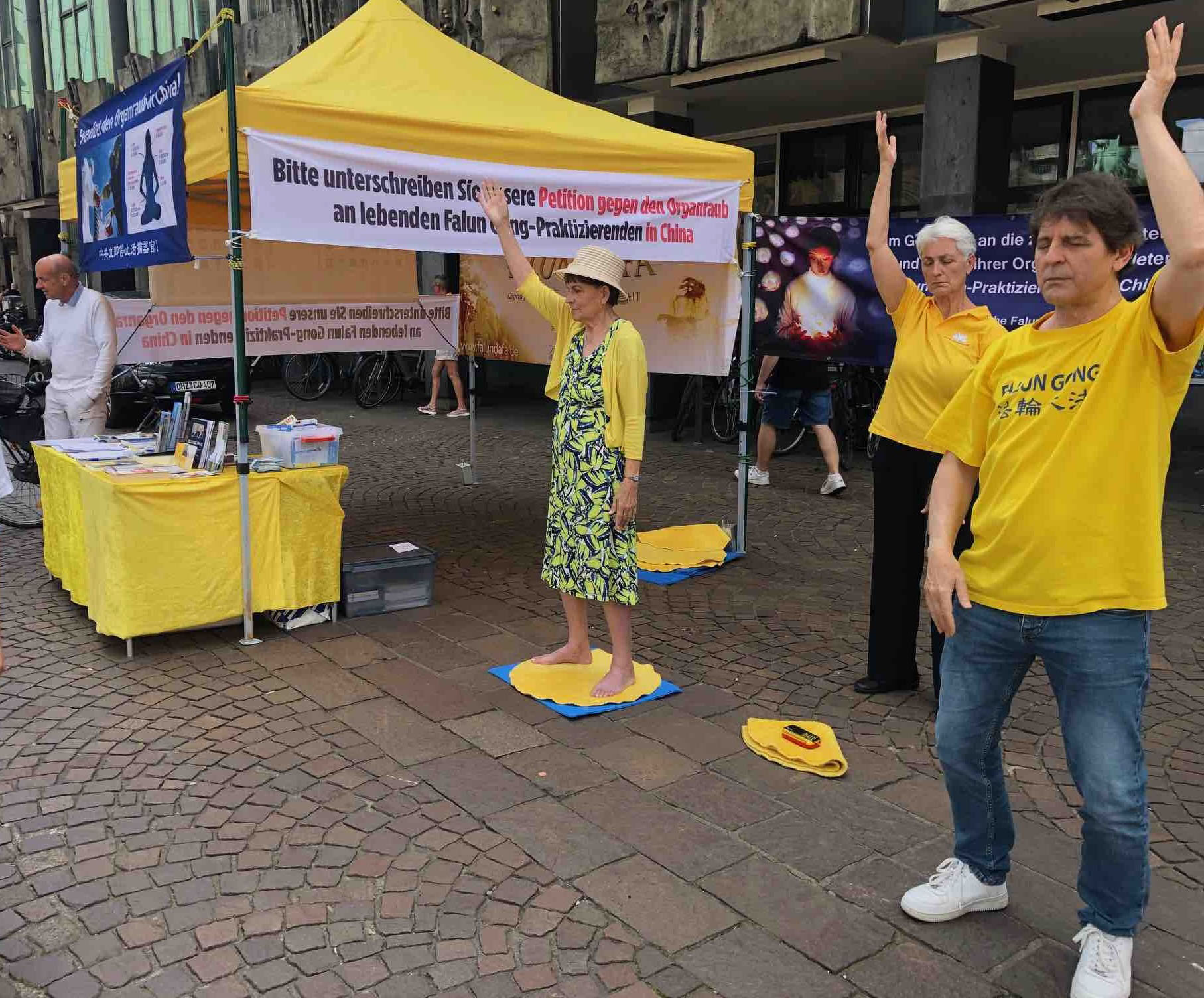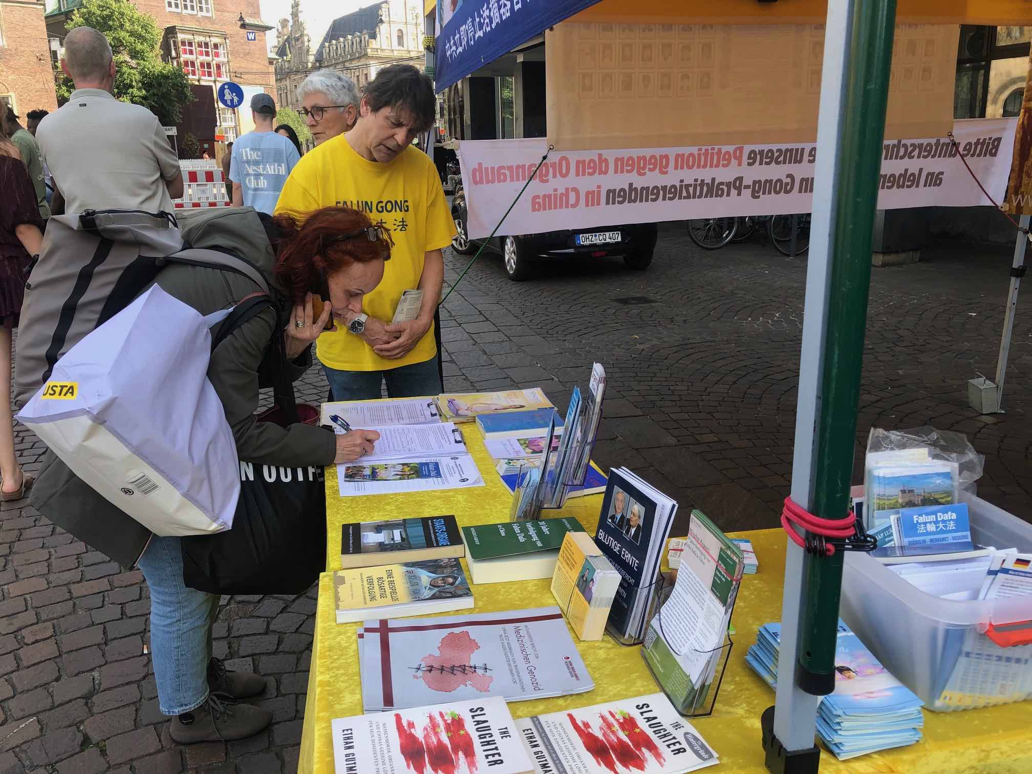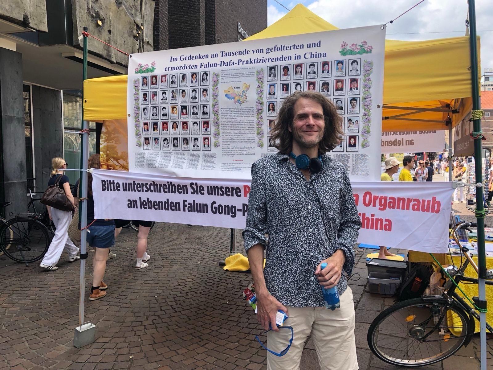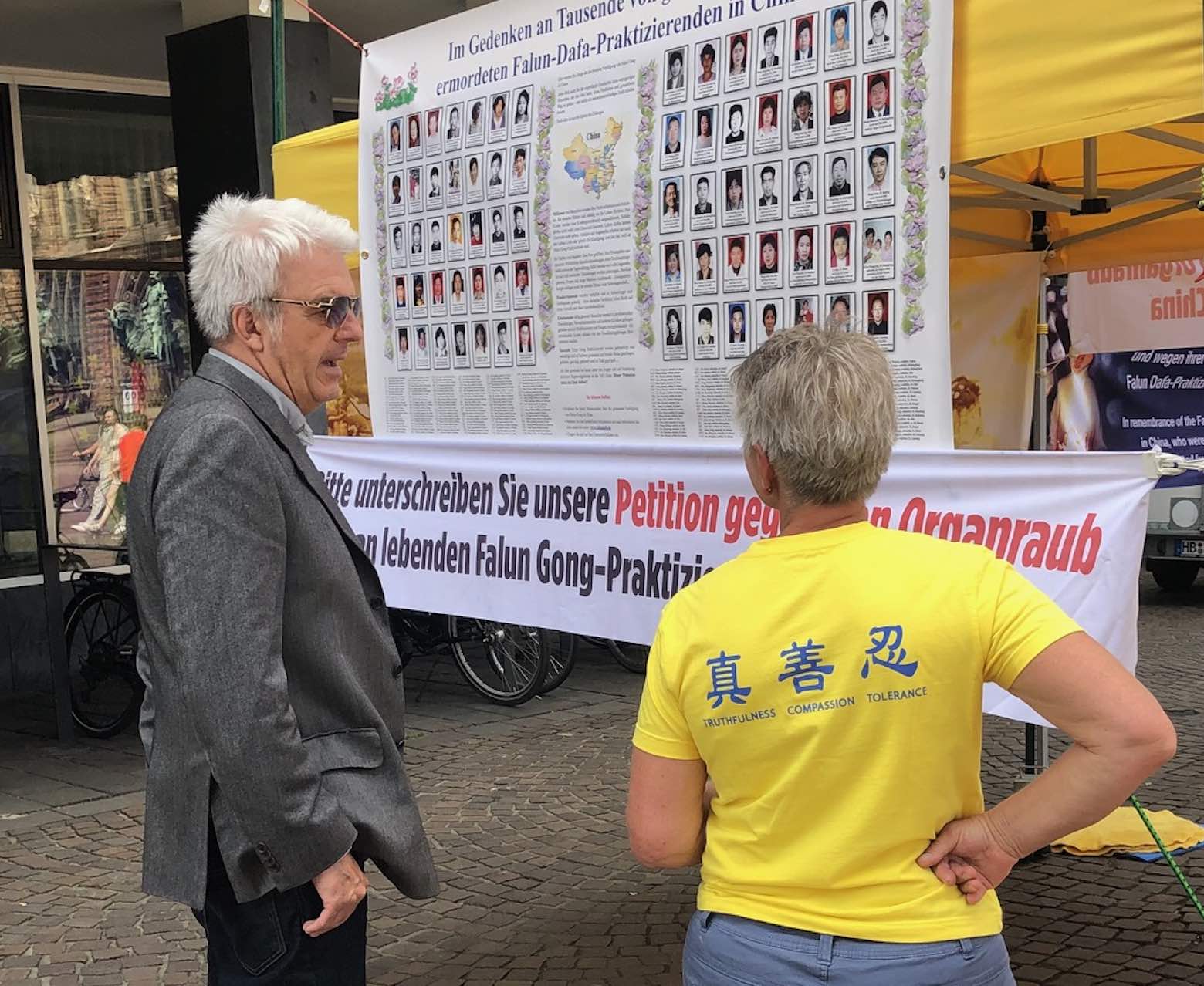 一位八十二歲的退休教師於爾根(Jürgen)先生激動地說道:「你們站在這裏向人們揭露中共惡行,這很好。絕不允許摘取器官,必須全面禁止!無論如何都不能允許。我們是人類,人類不應該做如此殘忍的事情。上帝也禁止這樣做。」臨走前他再次說:「你們做的對,我全力支持你們!」