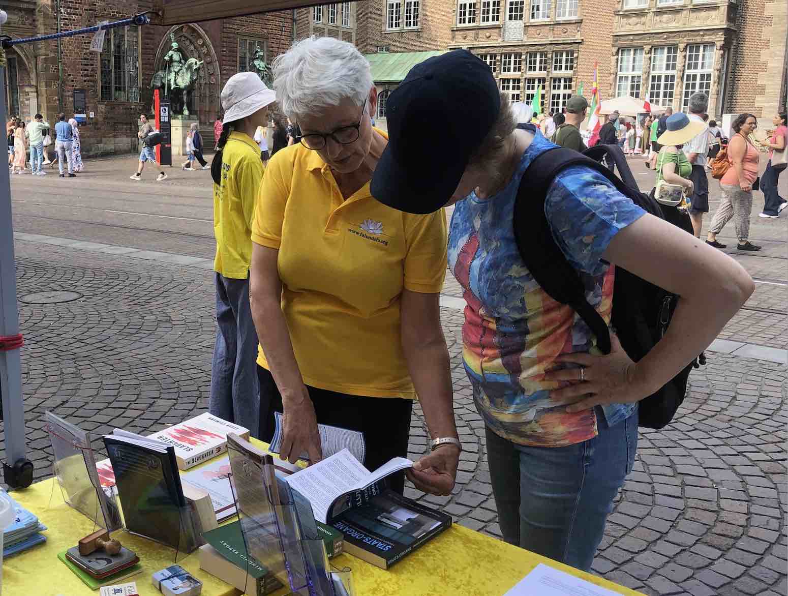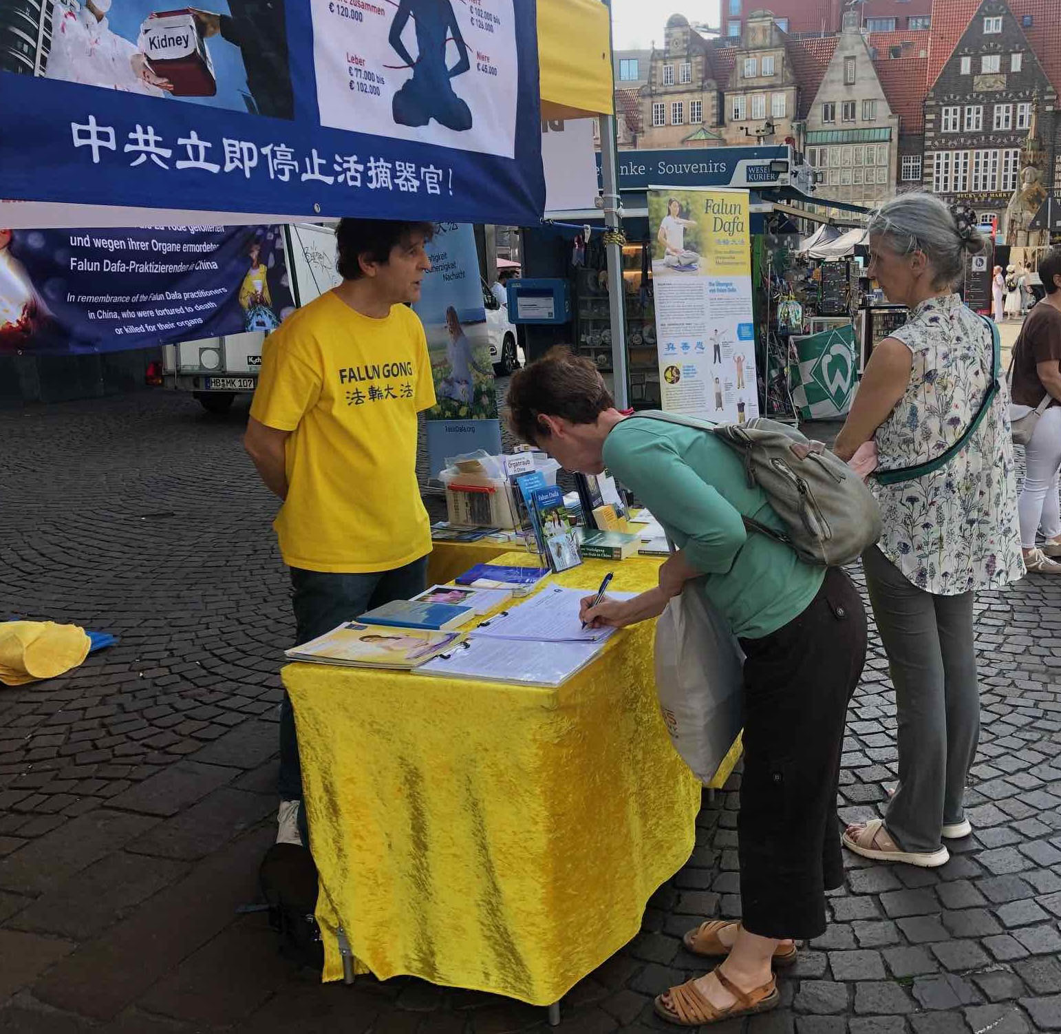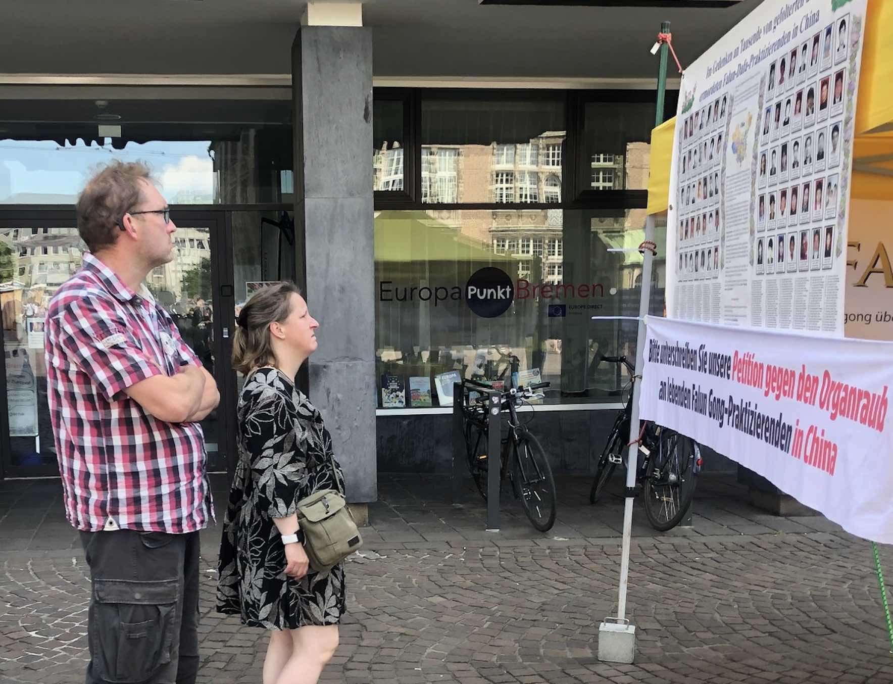 信息桌前一位老先生看著一條橫幅,上面有一小部份受迫害者的名字和照片。他感歎道:「這(中共)是恐怖的化身,的確是恐怖的化身。」 讀到遇難者的名字,看到他們的照片,不來梅人明顯受到觸動。