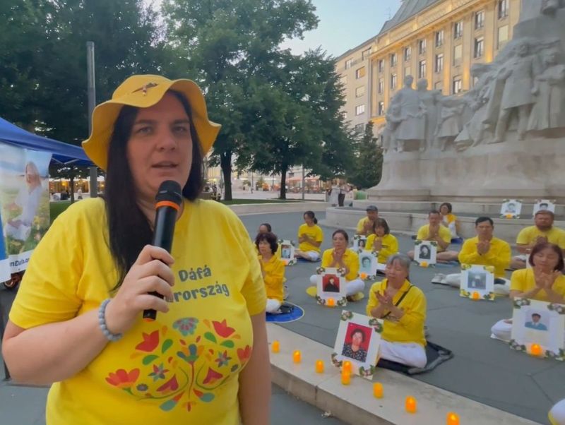 匈牙利法輪大法學會發言人埃斯特(Eszter)女士在集會中發言,她說:「一九九九年七月二十日,前中共黨魁江澤民開始迫害法輪功,它叫囂『名譽上搞臭,經濟上截斷,肉體上消滅』。法輪功學員被抄家,被非法關押在勞教所、監獄和精神病院中,還不斷的遭受酷刑折磨甚至被虐殺,這種種族滅絕至今仍在繼續。」