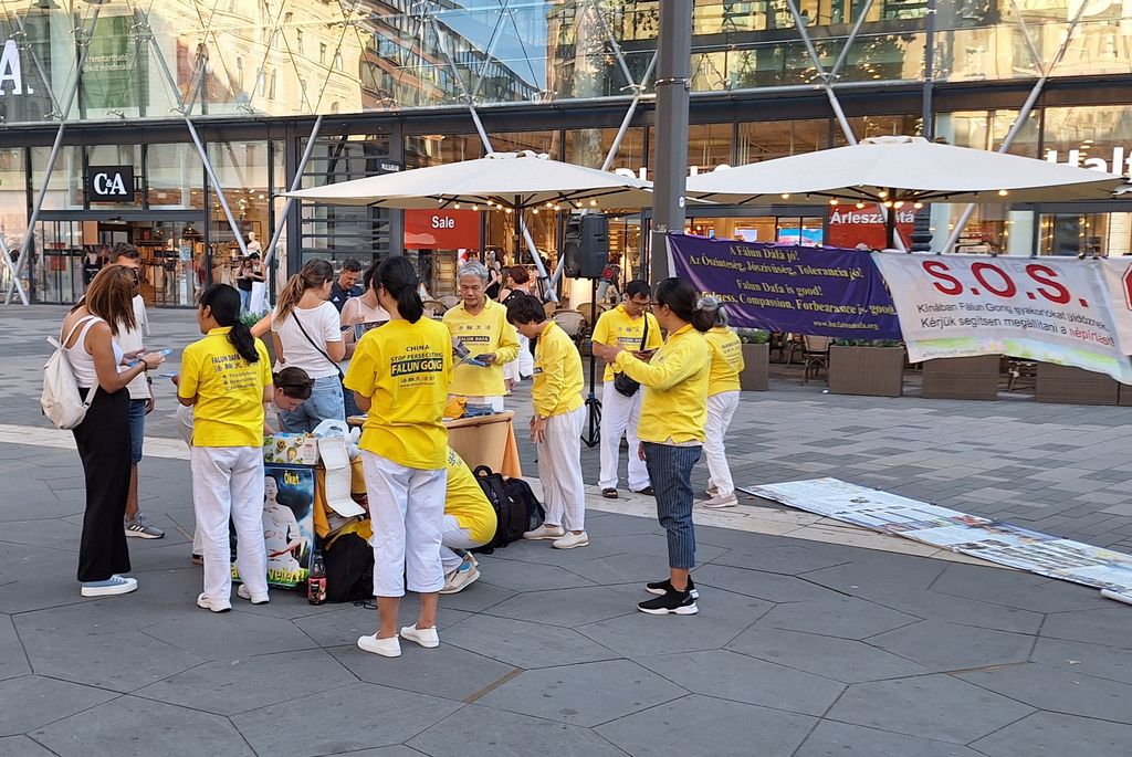 活動期間,學員們展開用匈牙利語和英語書寫的「法輪大法好」、「停止迫害法輪功」、「停止活摘器官」等橫幅,還展示五套功法,與路人交流,並在反對迫害法輪功的請願書上徵集簽名,最後以燭光悼念結束活動。