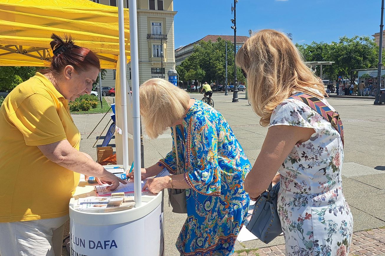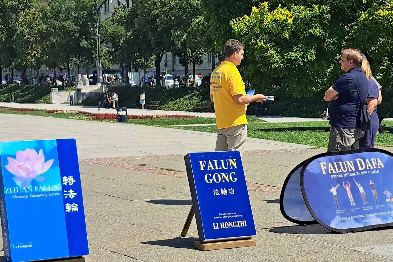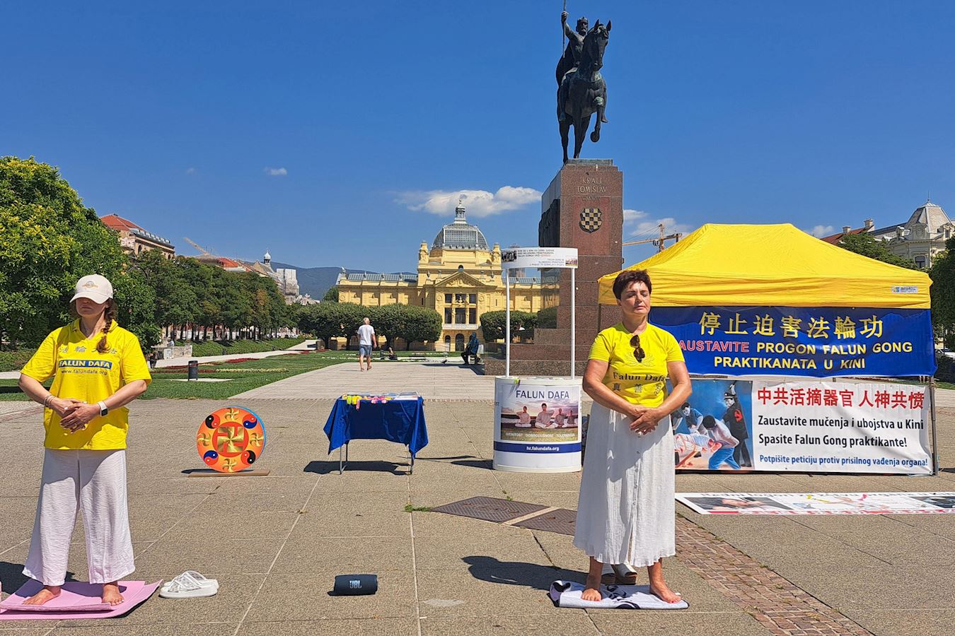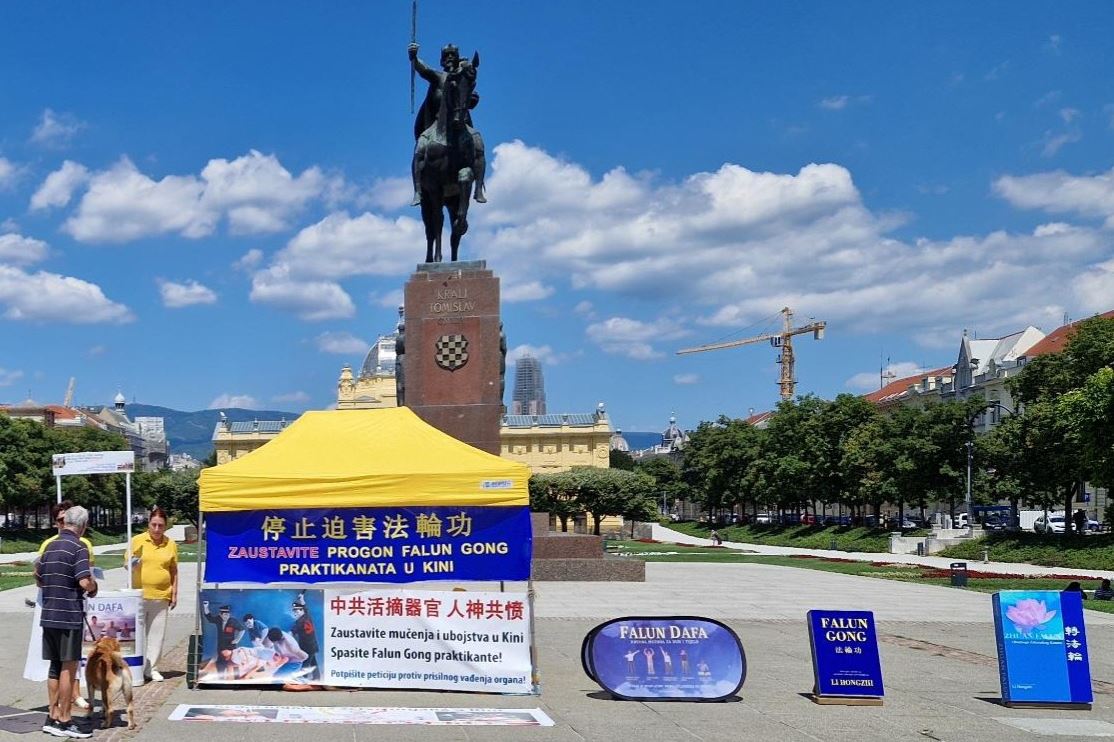 上午九點多,當地法輪功學員在市中心托米斯拉夫國王廣場(King Tomislav Square)布置好展台。醒目的黃色帳篷和藍色橫幅,讓行人遠遠就能看到橫幅上的中克雙語:「停止迫害法輪功」。