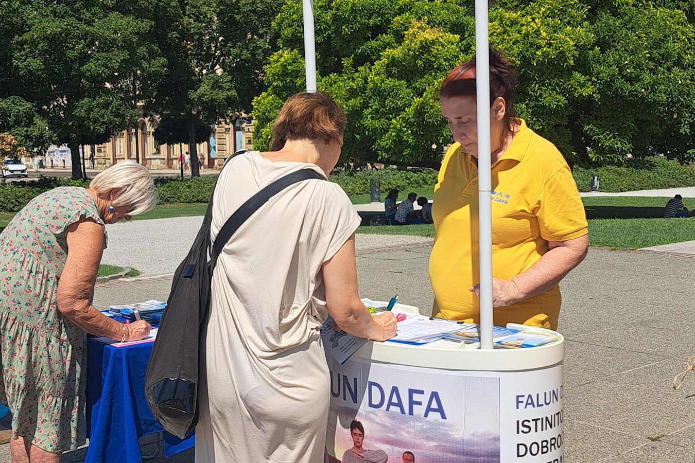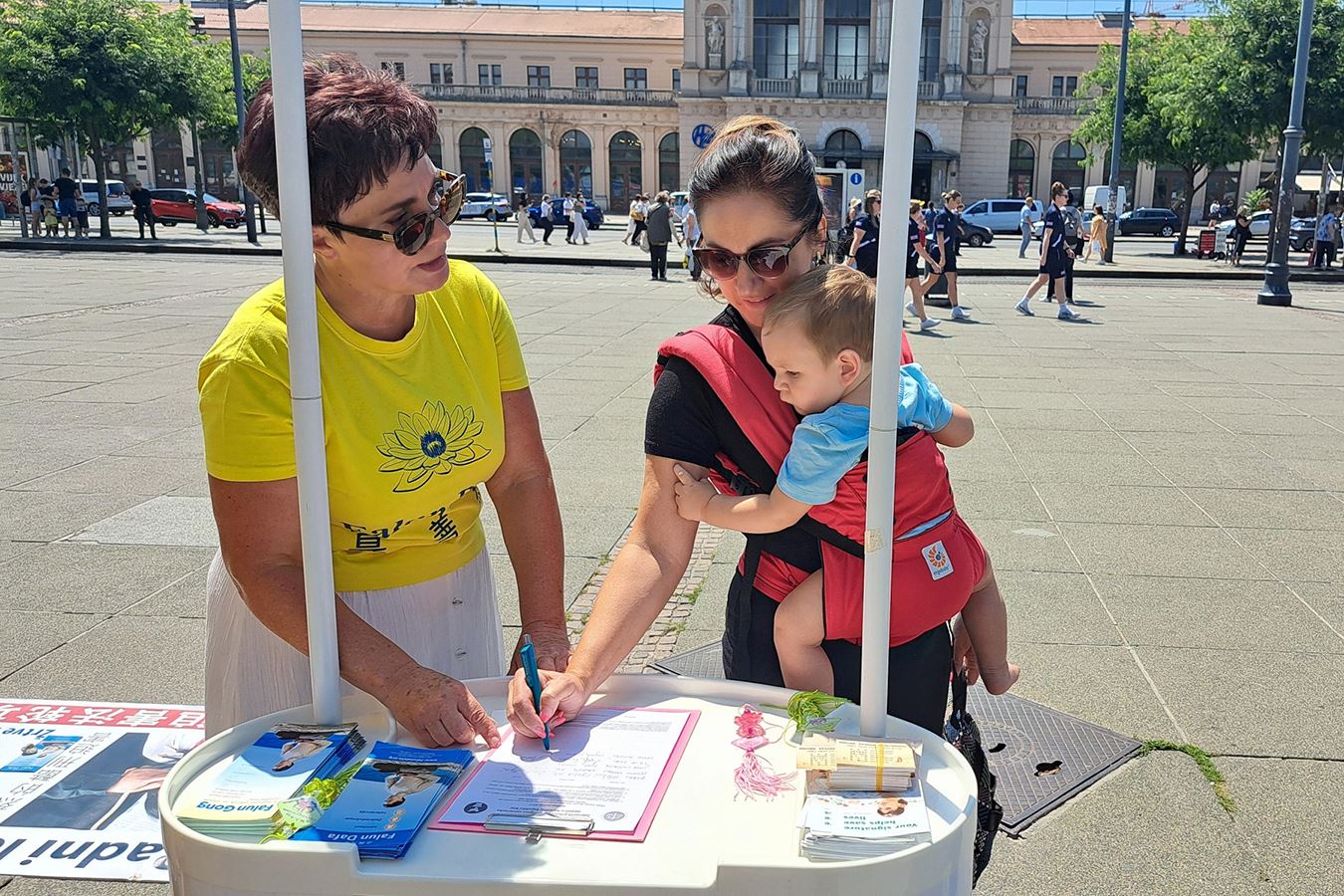 很多行人看到法輪功真相橫幅後,直接走到信息台詢問如何支持反迫害。背帶托著小嬰兒的教師納迪娜(Nadina)就是其中一位,學員告訴她簽名的地方。她立即到徵簽處簽名,她告訴學員:「就是應該簽名聲援,停止這種迫害。」