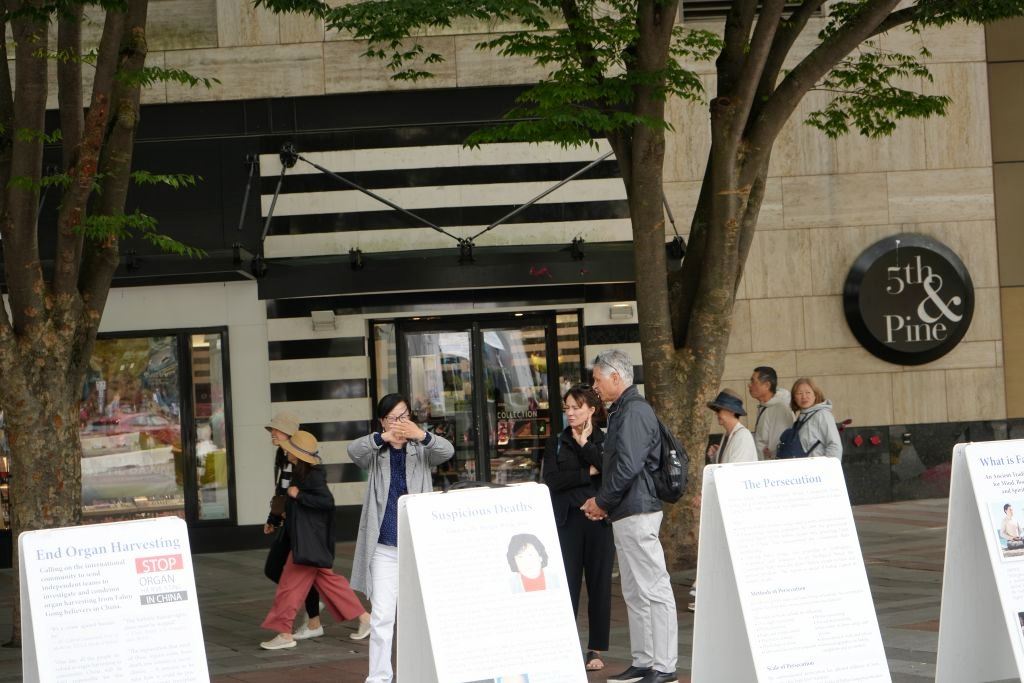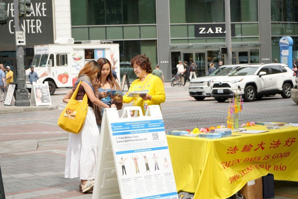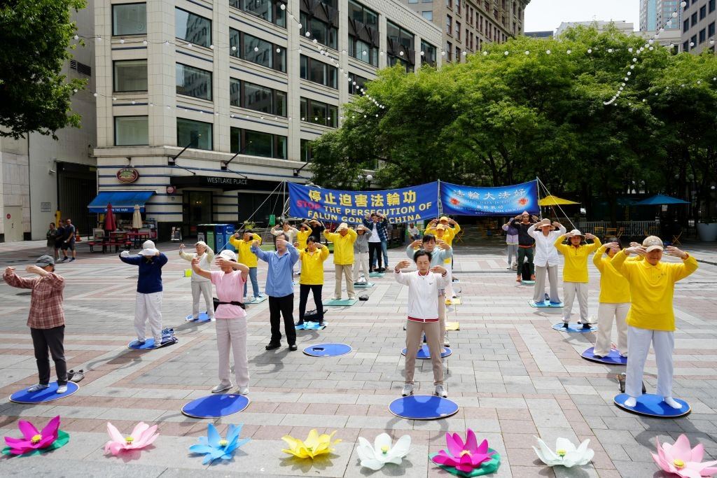 法輪功學員寧靜祥和的煉功畫面,如同西雅圖市中心的一道靜謐的風景。許多過往行人駐足觀望拍照,或者閱讀法輪功真相展板。有的主動詢問法輪功學員了解真相。