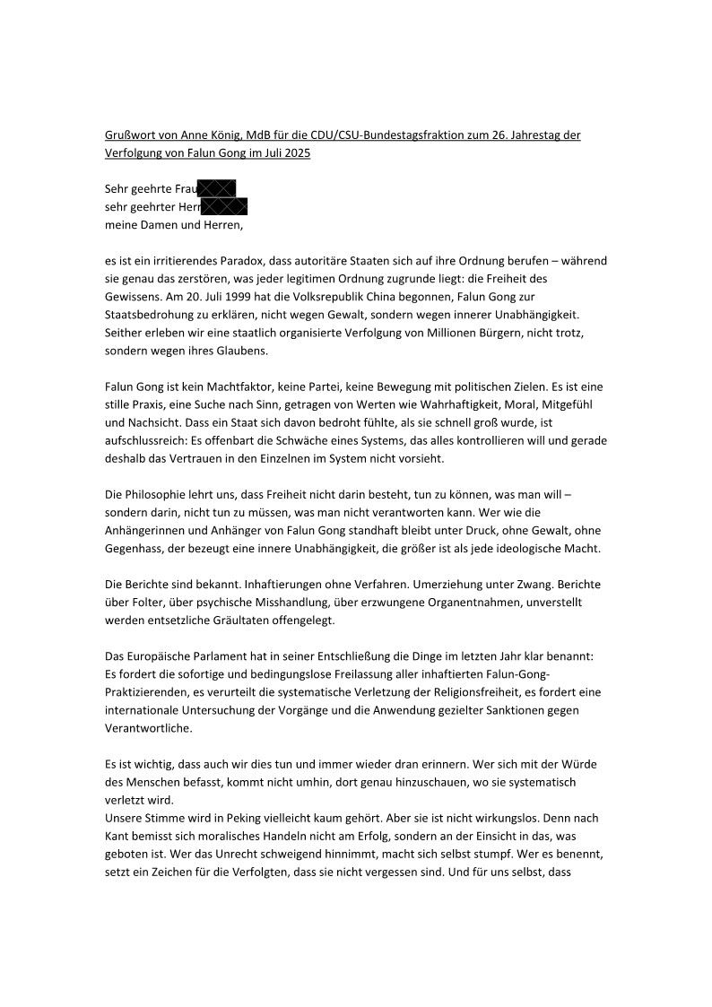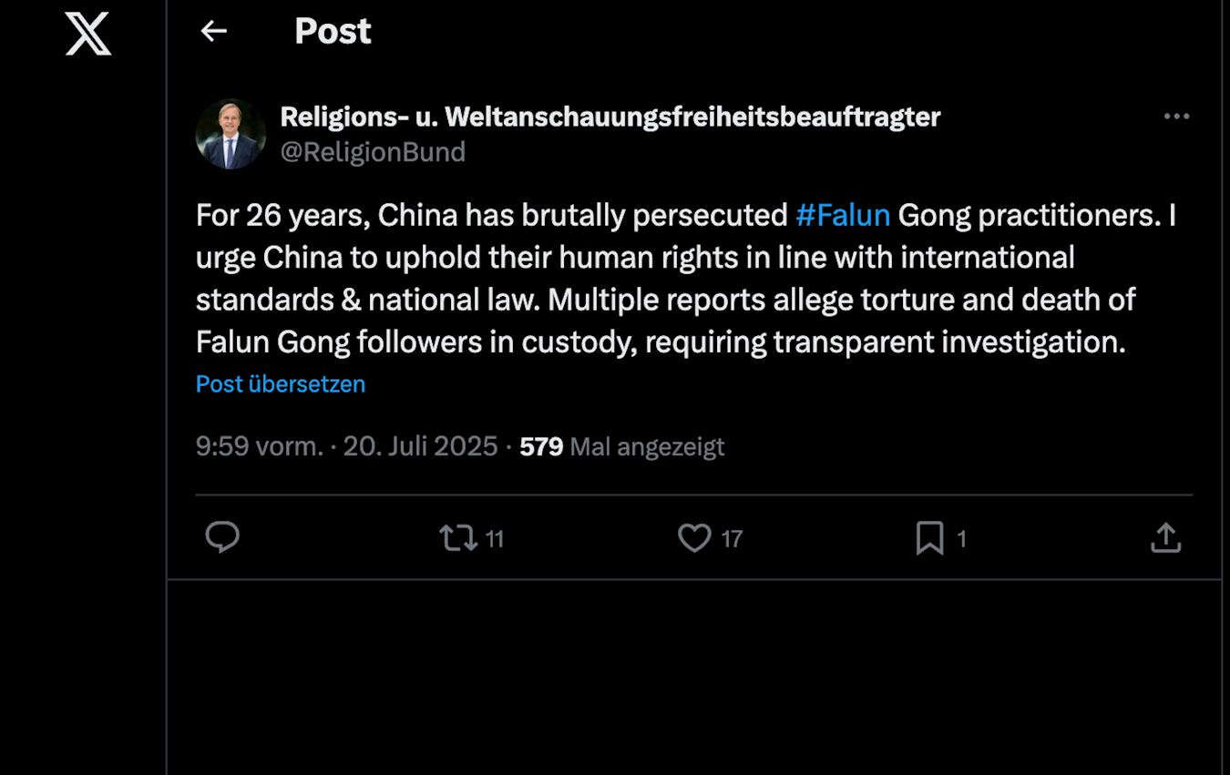 德國政府宗教與信仰自由專員、基民盟(CDU)聯邦議會議員、外國文化教育政策小組委員會成員托馬斯﹒雷切爾(Thomas Rachel)於七月二十日在X平台發聲援文章如下: