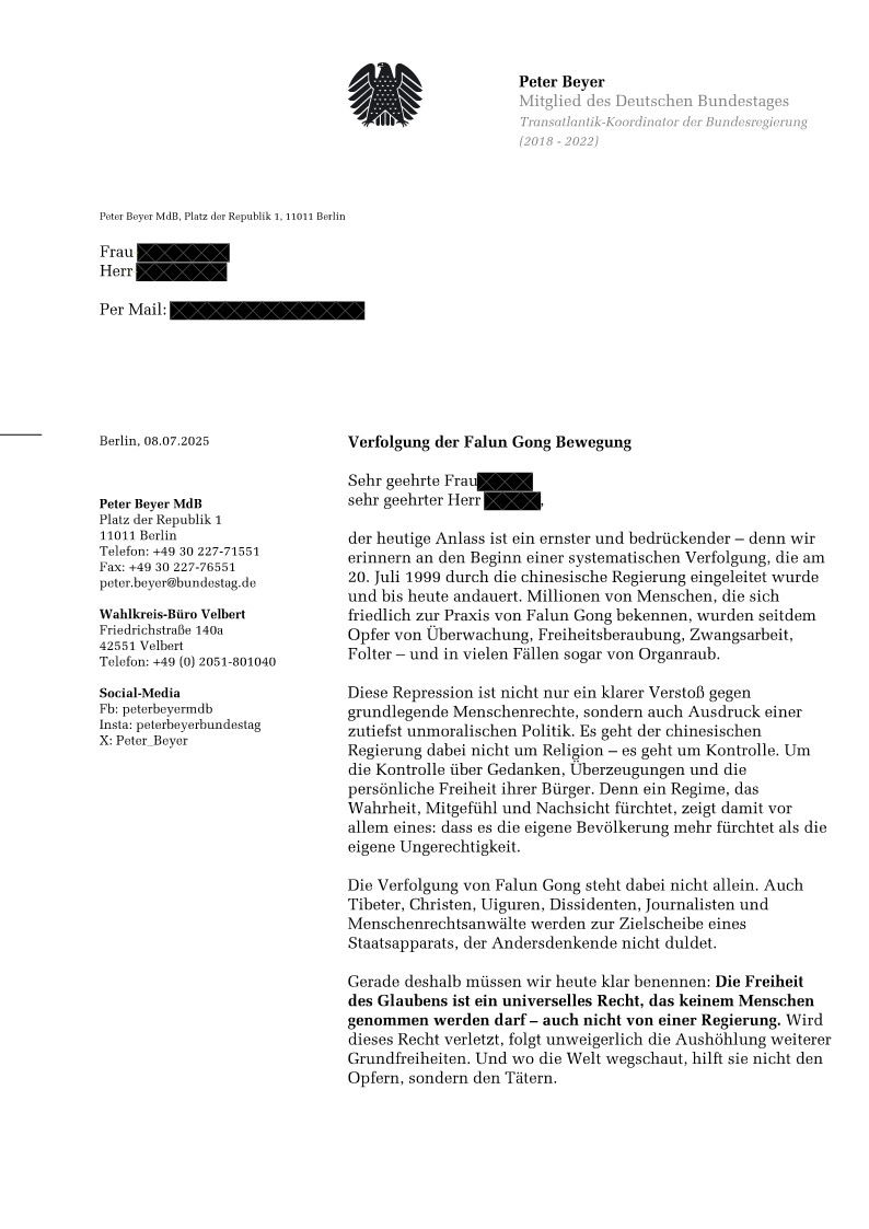 德國基民盟(CDU)聯邦議會議員、安全與穩定項目組主席彼得﹒拜爾(Peter Beyer)發來聲援信如下: