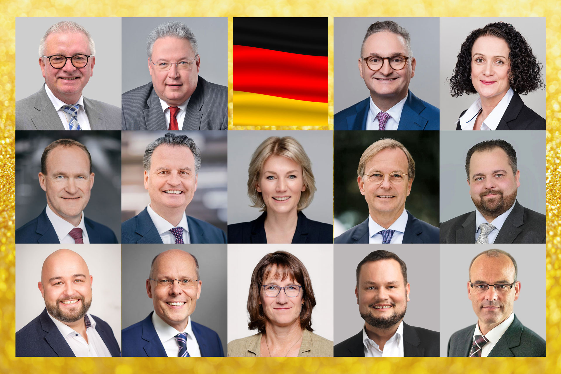 下排:德國聯邦議會議員喬納斯﹒蓋斯勒博士(Dr. Jonas Geissler),德國聯邦議會議員彼得﹒拜爾 (Peter Beyer),德國聯邦議會議員弗蘭齊斯卡﹒克斯滕博士(Dr. Franziska Kersten),德國梅前州議會議員勒內﹒杜馬克 (René Domke),德國聯邦議會議員萊納﹒羅特富斯博士(Dr. Rainer Rothfuß)。(官網圖片合成)